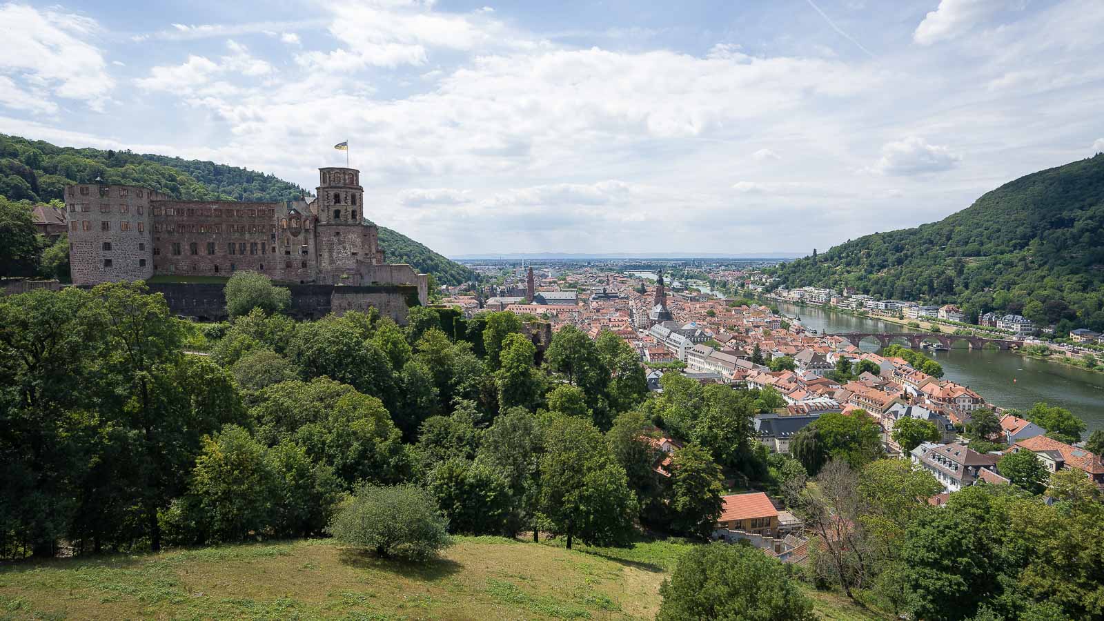 Mit Kappen überquerten wir dann den Neckar und erklommen nach einer Rechtsabbiegung zum Philosophenweg die der Stadt gegenüber liegenden Hügel. Die Aussicht von dort auf Neckar, Schloss und Odenwald ist so phänomenal das wir auch gleich ein kleines Bank-Päuschen machten um die Ansicht zu geniessen. Auf den Bildern ist von dem Schloss leider nicht so viel zu erkennen da es zu sehr im Gegenlicht lag. Die beste Zeit für Fotos wäre hier der späte Nachmittag an dem das Schoss von der Sonne angeleuchtet wird.