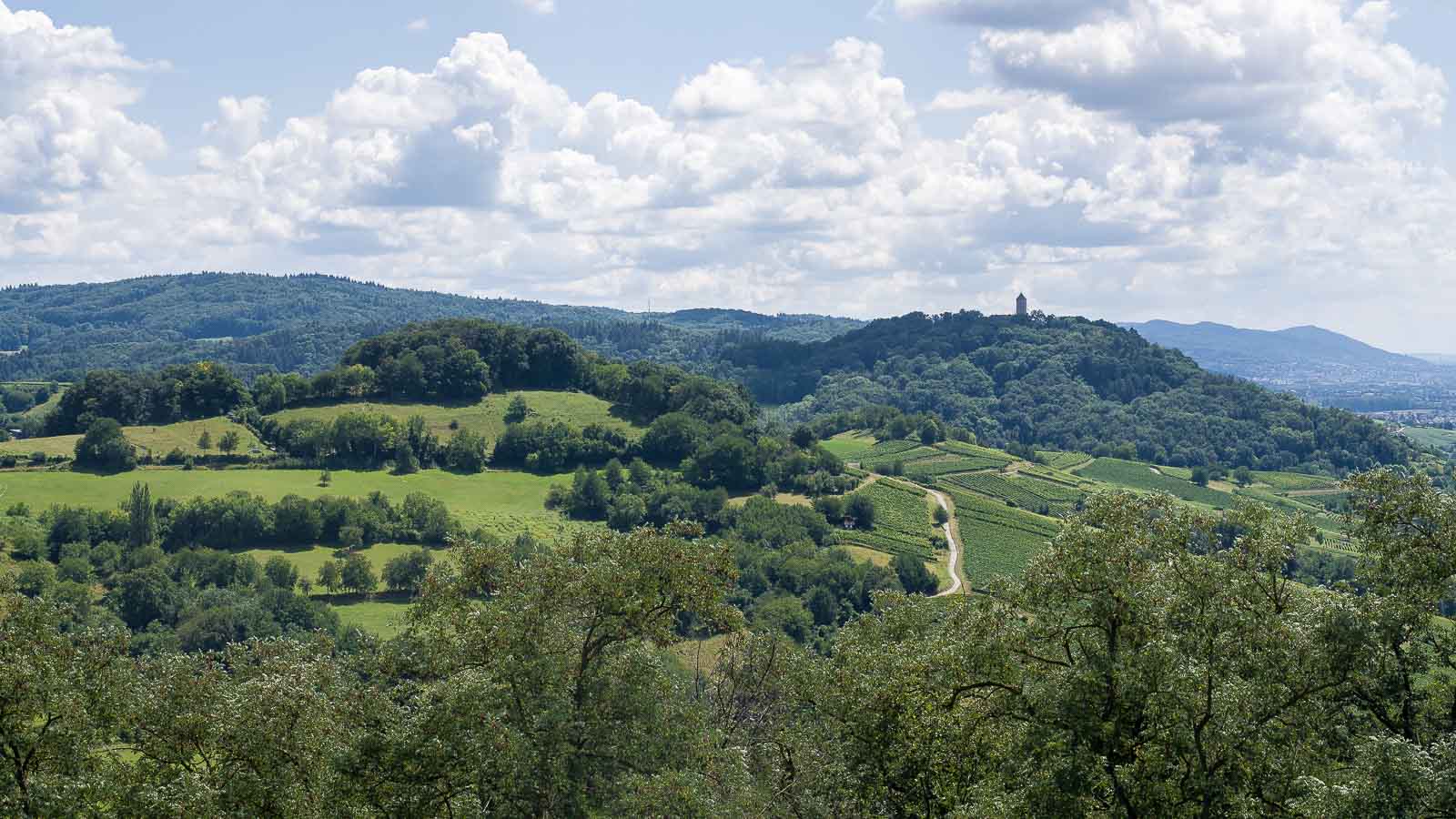 Kurz vor dem nördlichsten Punkt unsere Wanderung ging es bergauf zum Hemsberg. Jetzt wanderten wir durch den Wald. Oben auf dem Berg (262 m) steht ein Turm der vom Odenwaldverein errichtet wurde. Am Wochenende wird er bewirtschaftet. Wir hatten Glück, zwei Vereinsmitglieder waren vor Ort und stockten die Getränkevorräte auf. Sie ließen mich auf den Turm rauf krabbeln, von dem ich den Blick auf Bensheim und in Richtung Starkenburg (bei Heppenheim) geniessen konnte.