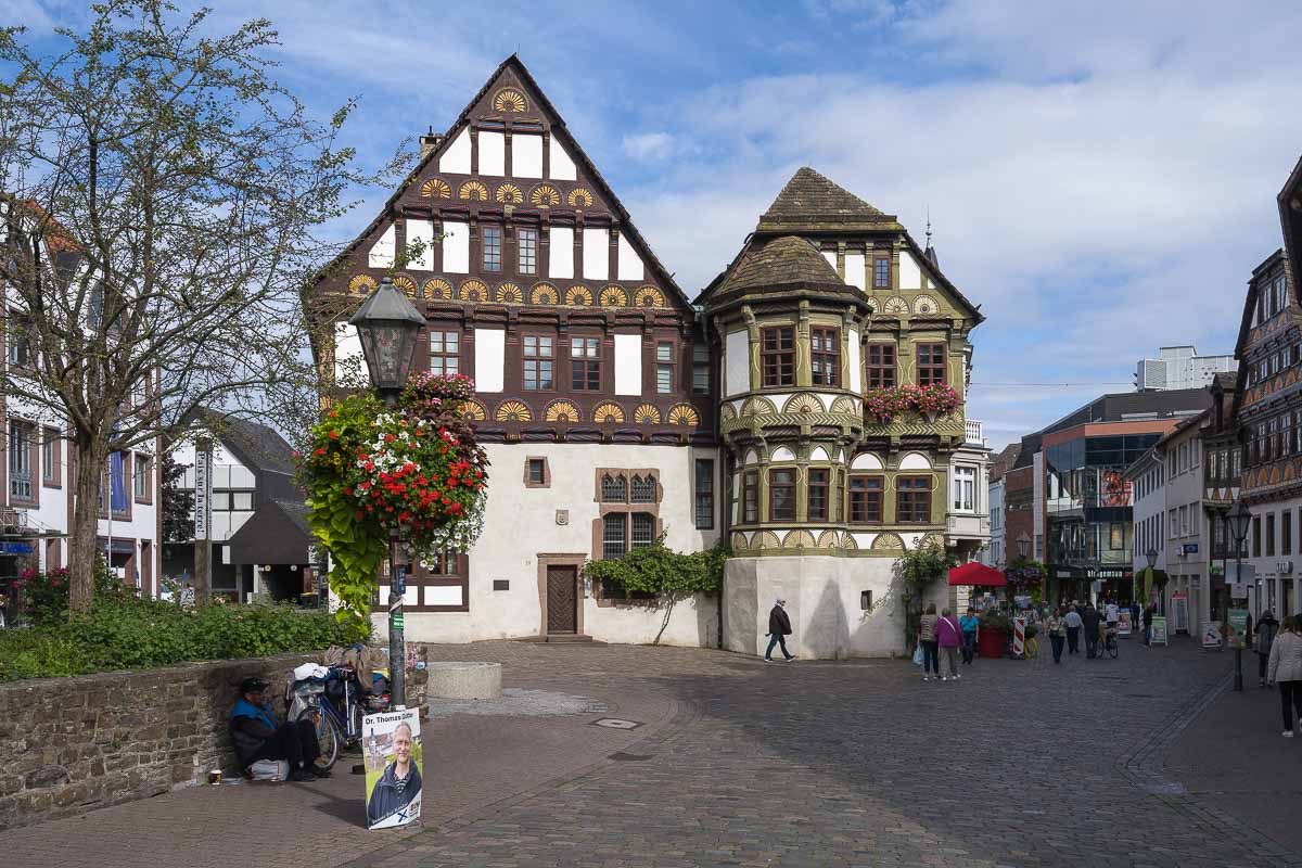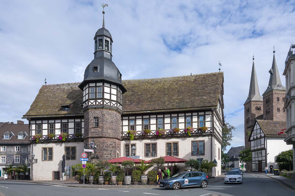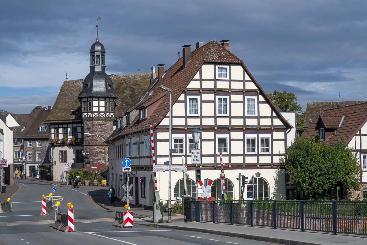 Den Rundgang im Ort machten wir dann entgegengesetzt zum Uhrzeigersinn. Höxter ist ein richtig schönes, altes Städtchen mit viel Fachwerk und einer schnuckeligen Fußgängerzone. Nach einer Runde durch die Altstadt kamen wir an der Weser an und wanderten noch etwa 500 m am Fluss entlang bevor wir nach rechts in Richtung Ringwall abbogen. Auf diesem baumbestandenem Wall umquerten wir dann die ganze Altstadt bis wir wieder an der Weser ankamen.