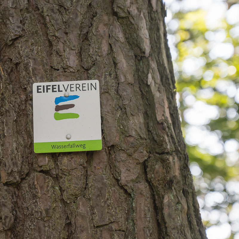 Hinter Pitscheid geht der Weg bergab in das Armutsbachtal. Diese Wegstrecke ist als Wasserfallweg beschildert. Nun denn, Wasserfälle hat man hier nicht zu erwarten. Bei diesem Weg handelt es sich um einen Hauptwanderweg des Eifelvereins. Er verläuft über 134 km von Bad Münstereifel nach Lieser an der Mosel.