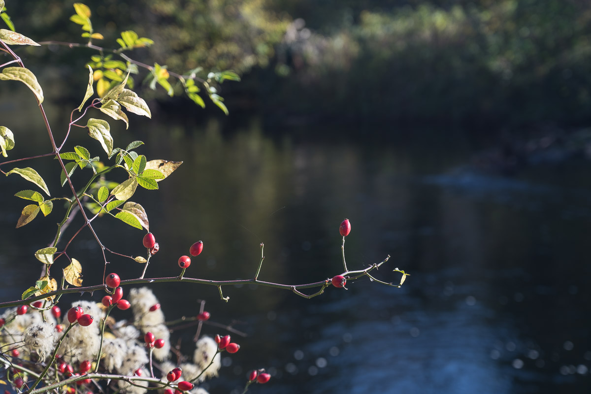 Bald mußten wir erneut die Rur überqueren und wo Licht ist, da ist bekanntlicherweise auch Schatten. Will meinen : das wir nun der Sonne ade sagten und eine „Schattenwanderung“ begannen. Gut das wir unsere Mützen dabei hatten, denn es wurde nun auch deutlich kälter. Etwas entschädigt wurden wir durch die Aussicht auf das noch sonnenbeschienene, gegenüberliegende herbstliche Seeufer.