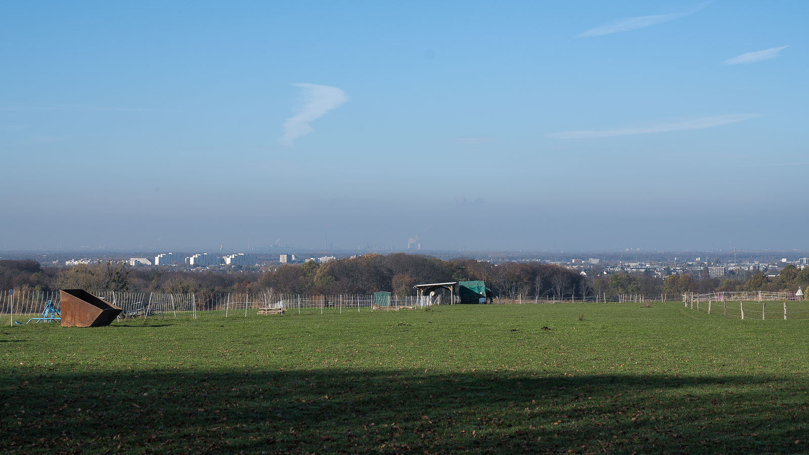 Nun denn, wir kamen heil oben an und umrundeten dann ein gigantisches Rübenfeld um auf den asphaltierten Feldweg in Richtung Segelflugplatz zu kommen. Hier liefen wir dann ca. 2 km gerade aus. Wir kamen an einem Reiterhof vorbei, hinter dem man eine schöne Aussicht in Richtung Ruhrgebiet hat. Laut Karte heißt dort ein Punkt „Ruhrgebietsblick“. Ist aber m.E. nach nicht soo dolle.