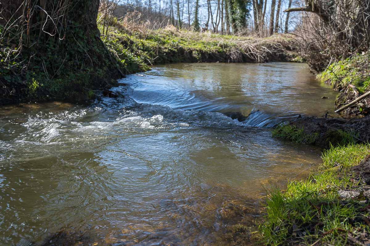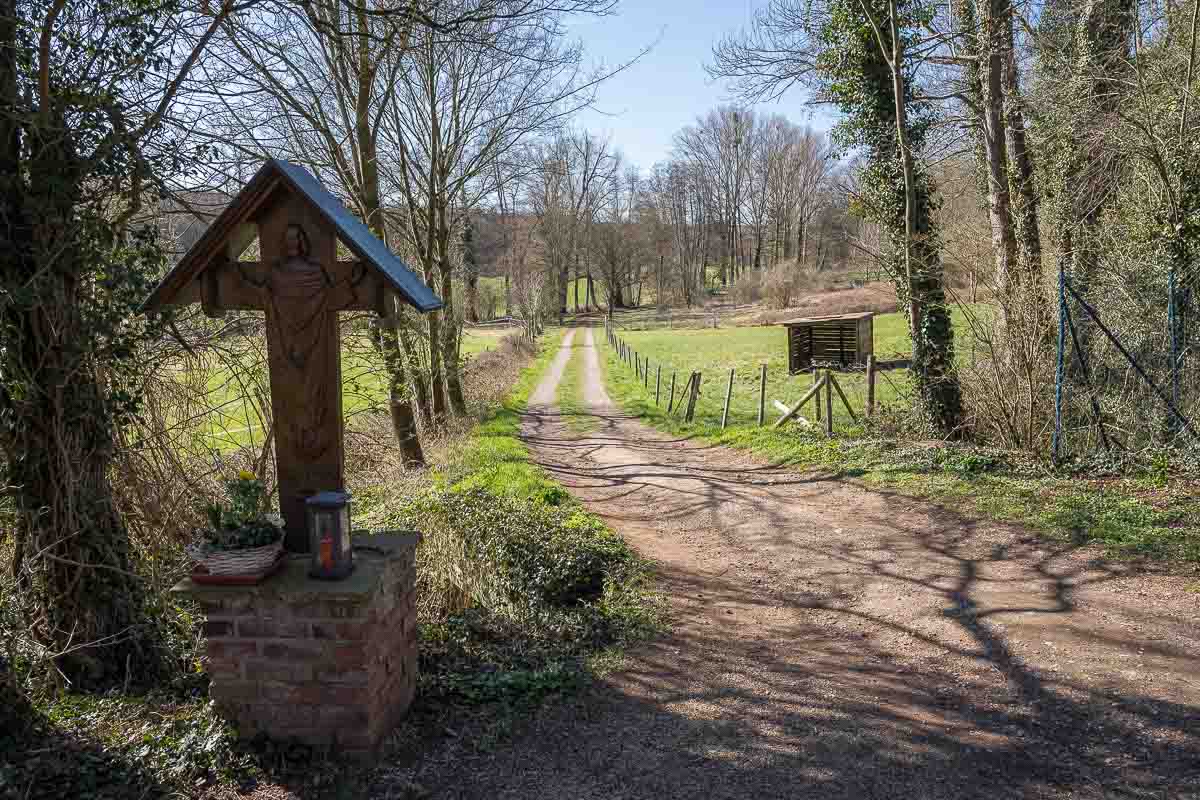 Etwas bedrückt verließ ich dann die Burg und setzte meine Wanderung fort. An der Pfarrkirche vorbei erreicht ich das Tal des Veybaches. Dieser ist ein Nebenbach der Erft und befüllt die Wassergräben des Wasserschlosses. Der Bach plätscherte munter vor sich hin. Der Begleitweg war auf der Karte mit Wasserfallweg ausgeschildert. Das war vielleicht etwas übertrieben, aber es gab schon die ein oder andere Stromschnelle.