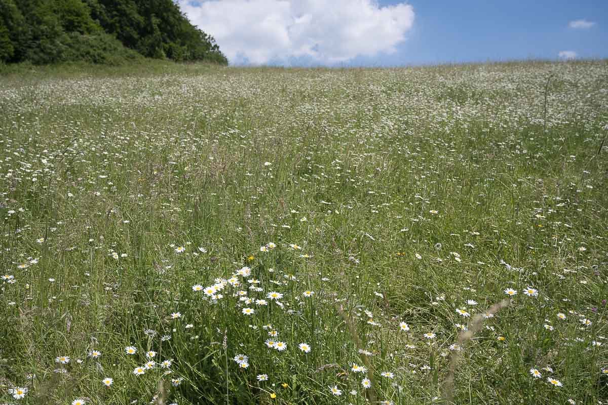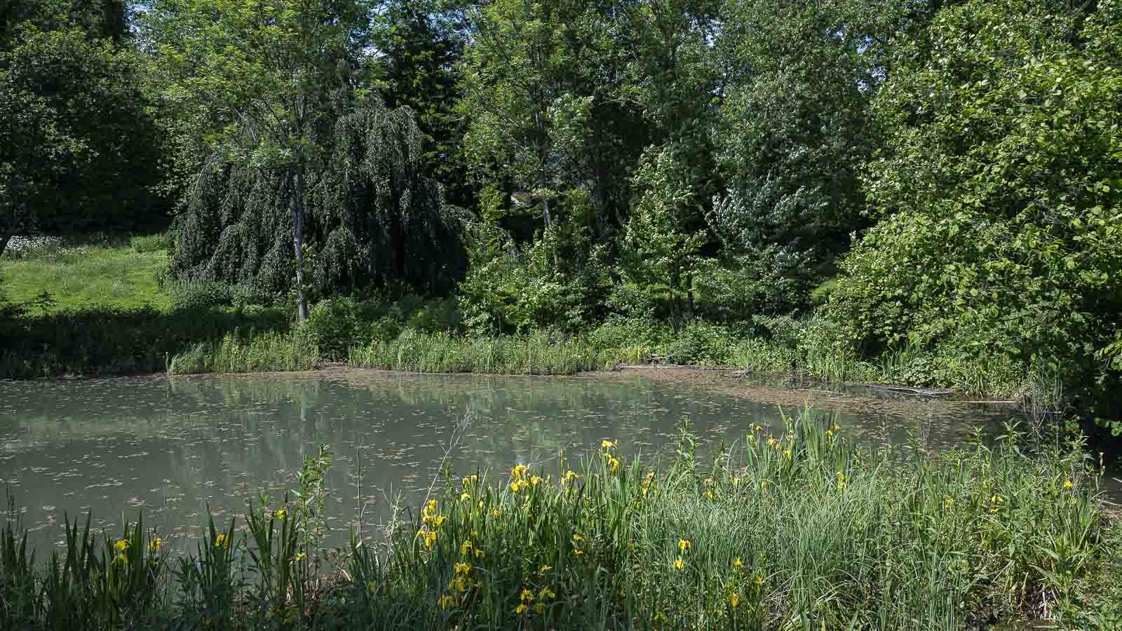 So waren wir froh als unser Weg von der Hauptstraße wegführte und uns in das Tal der Strunde brachte. Bis zum LVR Papiermuseum wanderten wir am Bach entlang unter Schatten spendenden Bäumen. Das Papiermuseum und sein Park können derzeit nur unter Voranmeldung per Internet besichtigt werden. Wenn man es noch nicht kennt, lohnt sich ein Besuch auf alle Fälle. Wir haben schon alle Kinder und Enkelkinder dorthin geschleppt. Auch bei auswärtigem Besuch, einem Kindergeburtstag o.ä. ist das eine gute Adresse. Heute aber ließen wir es links liegen und wanderten nach Überquerung der Landstrasse bergauf in den Ortsteil Sand / Dombusch.