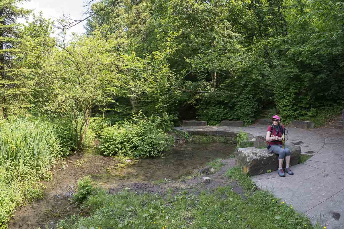 Von dort aus hatten wir das erste Mal einen schönen Ausblick auf das bergische Buckelland und der schönere Teil unserer Wanderung begann. Nach einigen abwechslungsreichen Passagen näherten wir uns Herrenstrunden. Kurz vor dem Ort bogen wir recht in den Wald ab und verkürzten so die Wegstrecke die an der Landstrasse entlang gelaufen werden mußte. In Herrnstrunden kamen wir zuerst an der Burg Zweiffel vorbei. Hier hatten wir vor einigen Jahren eine andere Wanderung gestartet. Unser heutiges Ziel war zunächst die Quelle der Strunde am Ortsende die wir damals nicht gesehen hatten. Die Quelle war mit einigen Steinen eingefasst und am Boden des kleinen Teiches konnte man beobachten wie das Wasser langsam von unten aus der Erde blubberte.