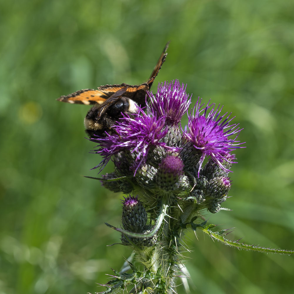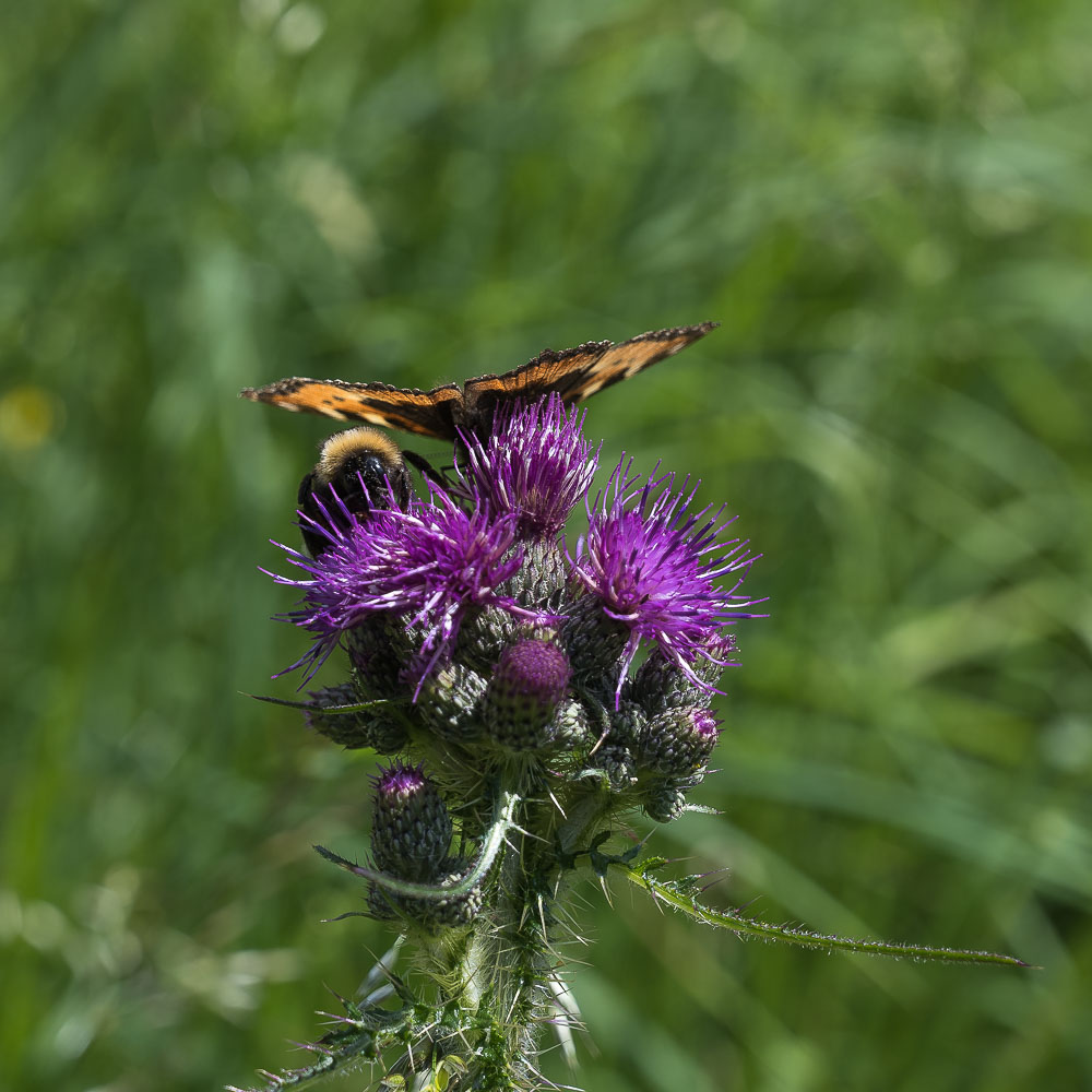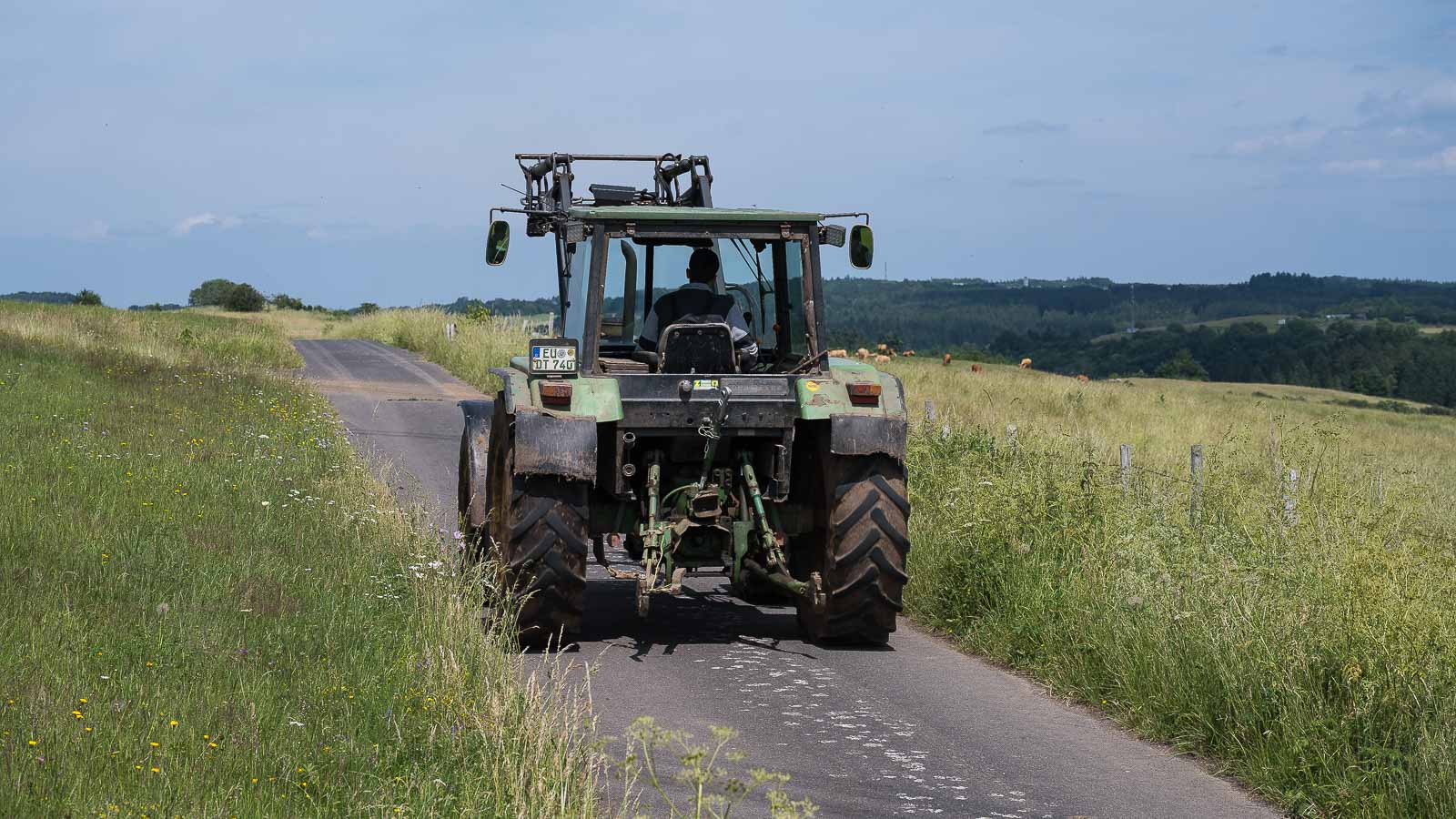 Nach etwa 4 km verließen wir den Wald und unser Weg führte uns durch offenes Gelände mit einer schönen Aussicht auf das Urfttal. In einigen Kilometern Entfernung, kurz vor der Urft, konnte man die dort verlaufenden Bahnlinie erkennen. Züge sahen / hörten wir keine, auch die Anzahl der Wanderer die uns begegneten konnten wir an den Fingern einer Hand abzählen. Lediglich von einem Trecker wurden wir überholt. Der gesamte Wanderweg war mit Bänken bespickt und so suchten wir uns eine mit Aussicht für unsere verspätete Mittagspause aus.