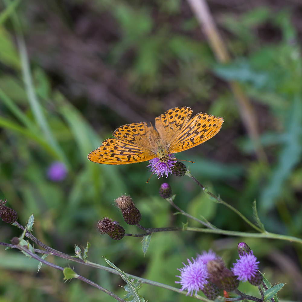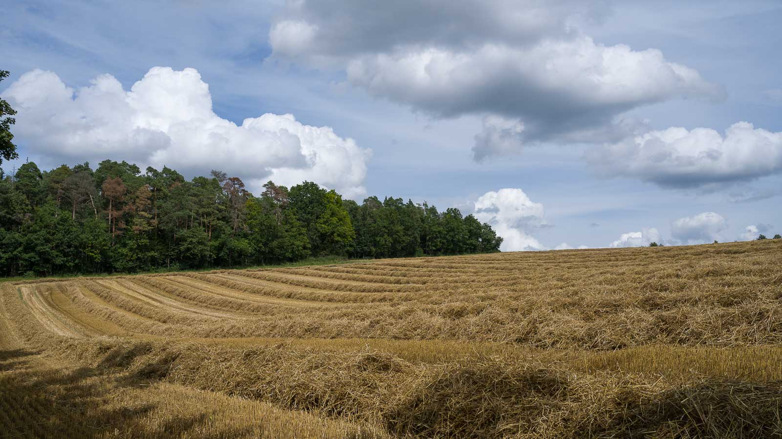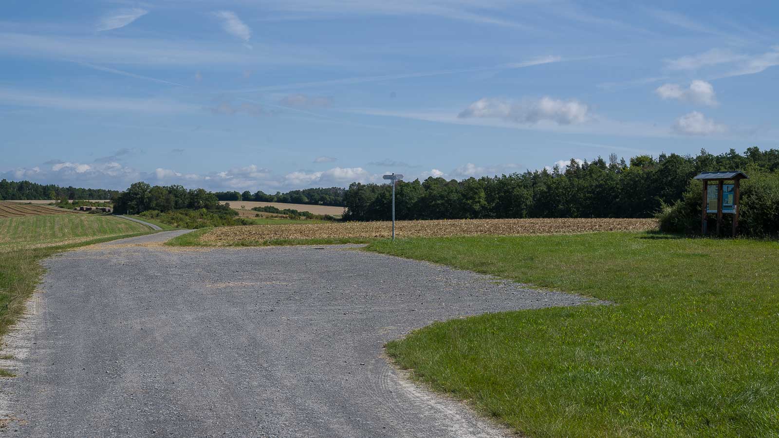 Fasziniert waren wir von den vielen Sonnenblumenfeldern, die in voller Blüte standen. So etwas haben wir im Bergischen Land und in der Eifel bis jetzt noch nicht so schön gesehen. Gegen Ende unserer Runde ging es vermehrt durch Wald. Erfreulich das sich die Borkenkäfer Schäden hier in Grenzen hielten. Es gab hier viel mehr Laubbäume, tote Nadelbäume sahen wir nicht. Was wir auch nicht sahen waren andere Wanderer, lediglich am Ende der Runde, kurz bevor wir wieder die Schlegelwarte erreichten, begegnete uns eine Familie mit 2 Kindern und 2 Hunden die hier ihre Runde drehten.