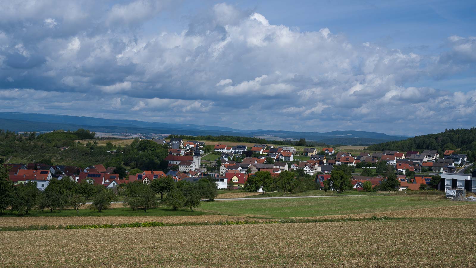Nach dem Abstieg vom Aussichtsturm wanderten wir los in Richtung Strahlungen. Der Weg führte meist über offenes Gelände und bot tolle Aussichten über das weite Land. In Strahlungen machten wir einen kleinen „side-step“ zur dortigen katholischen Pfarrkirche mit ihrem schönem Zwiebelturm.