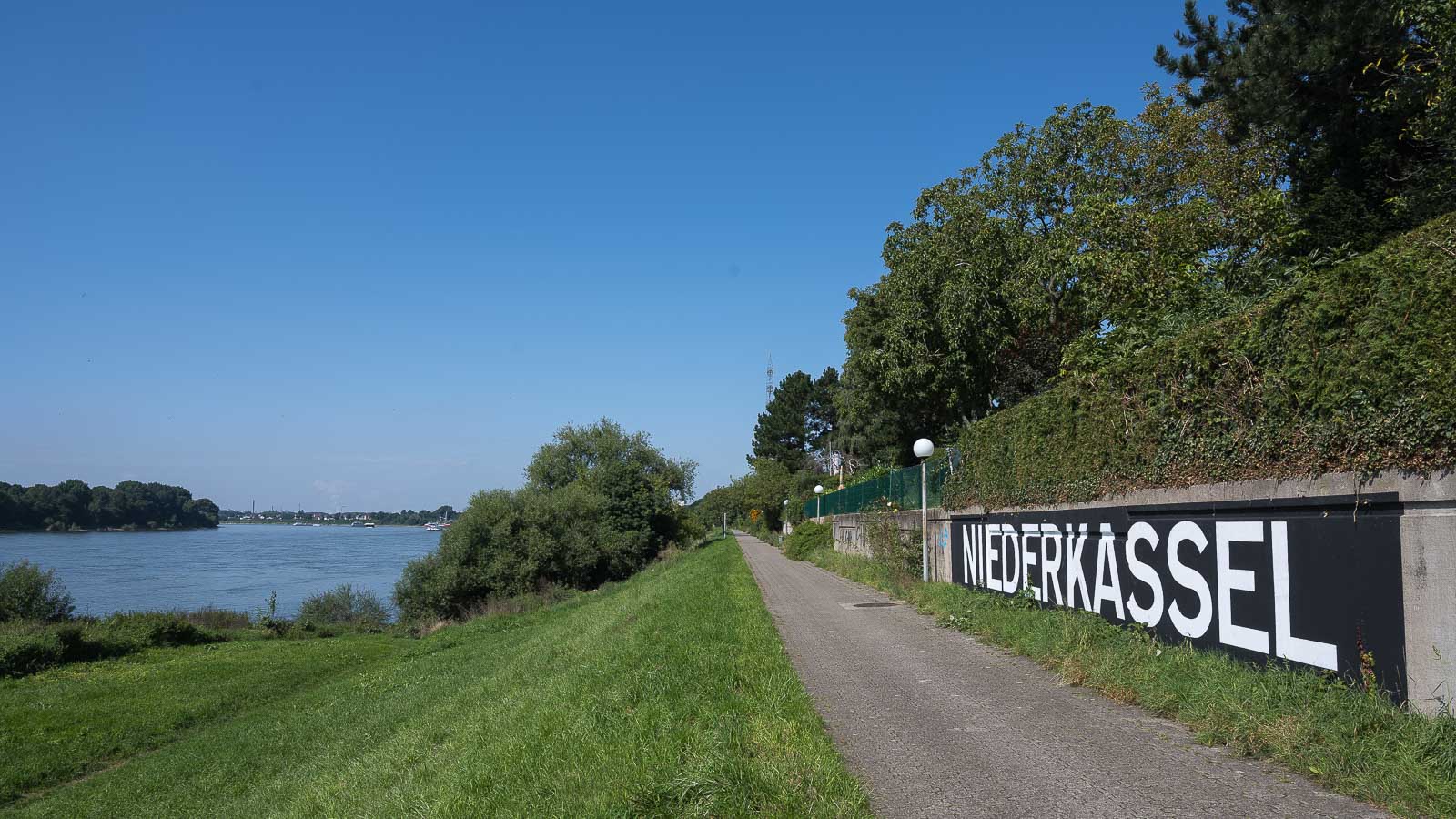 Der erhoffte Rheinblick in Niederkassel blieb dabei zunächst aus. Zwischen dem Weg, und später dem Deich und dem eigentlichem Ufer, standen hohe Bäume und auch dichtes Gestrüpp versperrte die Aussicht über den Fluss auf das andere Ufer.