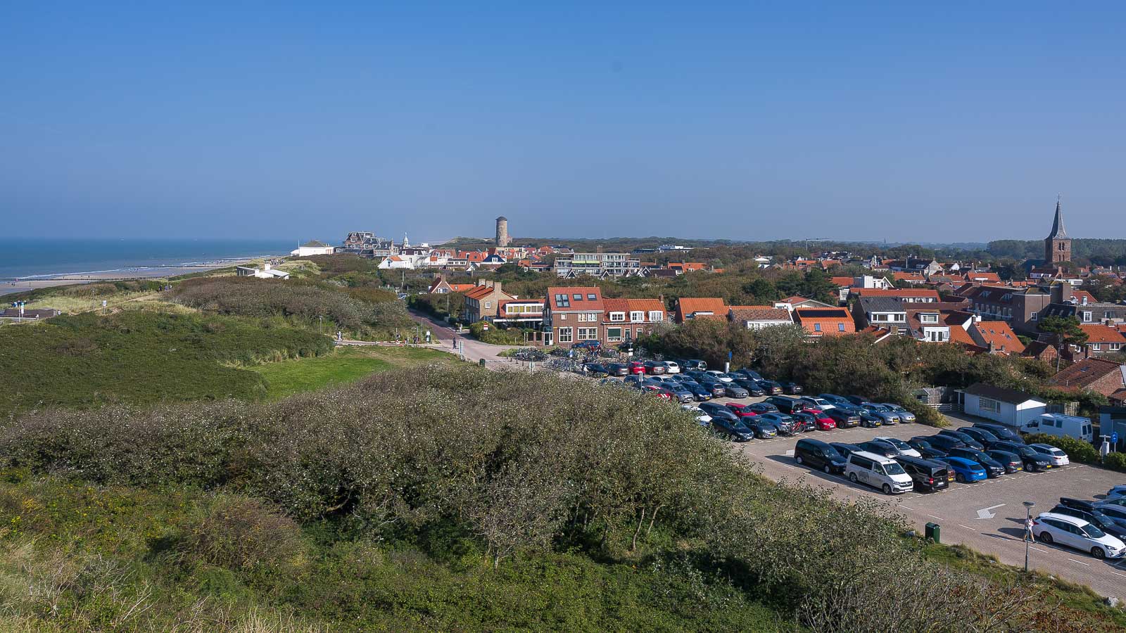 Unsere Unterkunft lag mitten im Ort und von dort starteten wir die hier beschriebene Runde im Uhrzeigersinn. Nach einem kurzen Schlenker entlang der Hauptstraße stiegen wir über Treppenstufen hinauf zum Hoge Hil der am südlichstem Rand der Dünenkette liegt. Die Dünen sind hier mit 25 m am höchsten und man hat eine schöne Aussicht über das Meer, den Strand und den Ort.