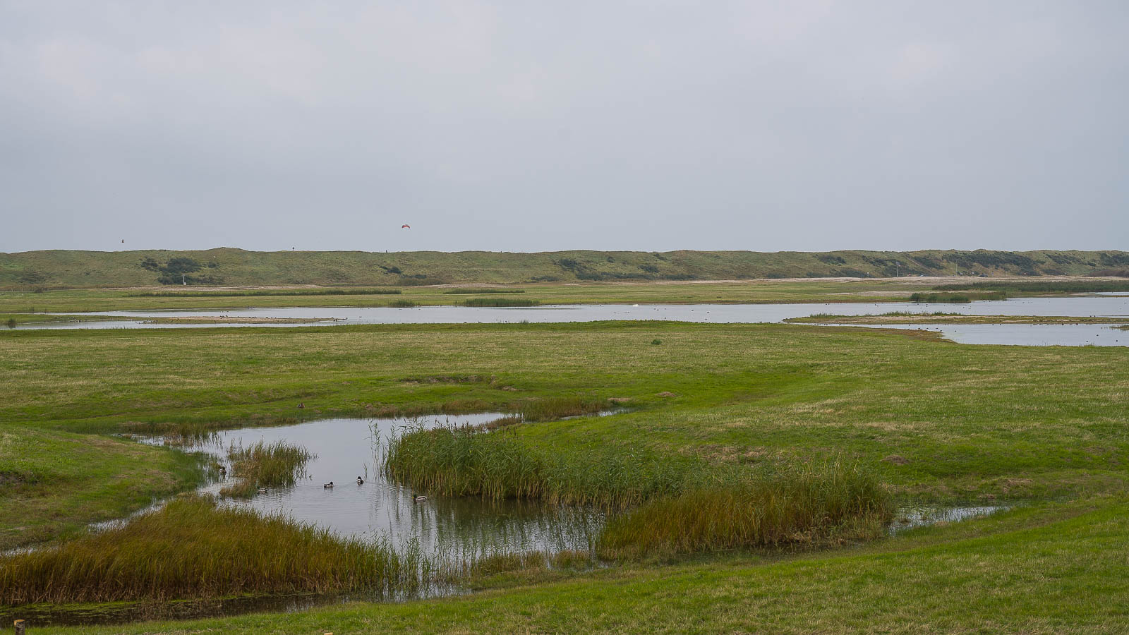 Der gleiche Weg zurück am Deich entlang wäre uns zu langweilig gewesen, daher suchten wir uns anhand meiner Handy-Karte eine Strecke durch das „Landesinnere“. Dabei kamen wir an einigen kleine Seen / Tümpeln vorbei die als NSG eingerichtet waren. Die vielen Vögel konnten wir aus der Ferne mehr hören als sehen. Kurz vor Domburg kehrten wir wieder zum Deich zurück, da dort die Strecke am Meer und durch die Dünen wieder sehr schön ist.
