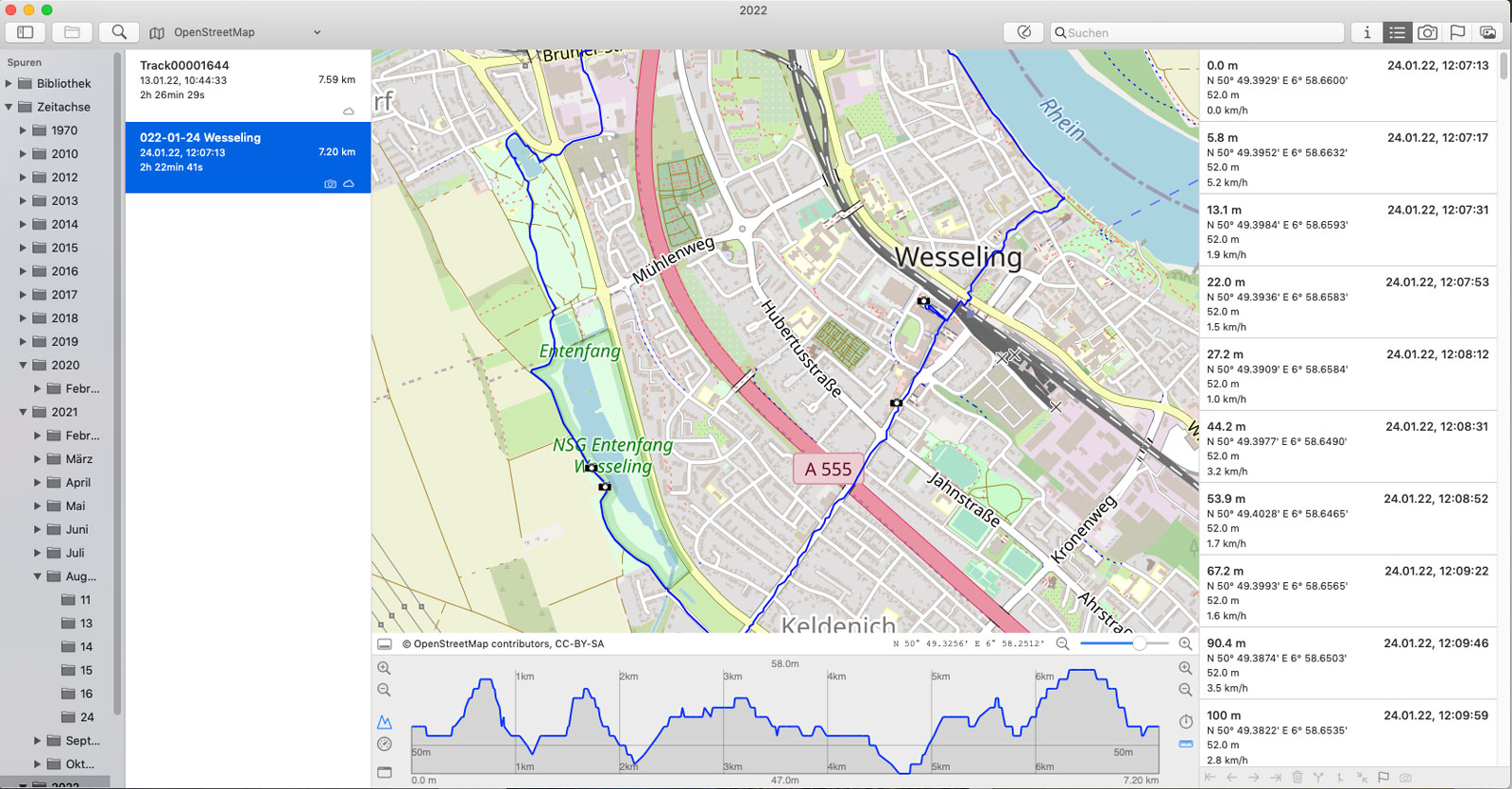 Erledigt wird diese Aufgabe von myTracks, einer App für OS-X die ich für diesen Zweck im App-Store erwarb (es gibt auch Versionen für iOS). Zunächst wird der Track in myTracks über Ablage=>GPX importieren…. in die App eingefügt. Dabei wird die Datei in das Verzeichnis
