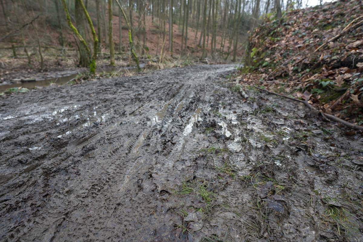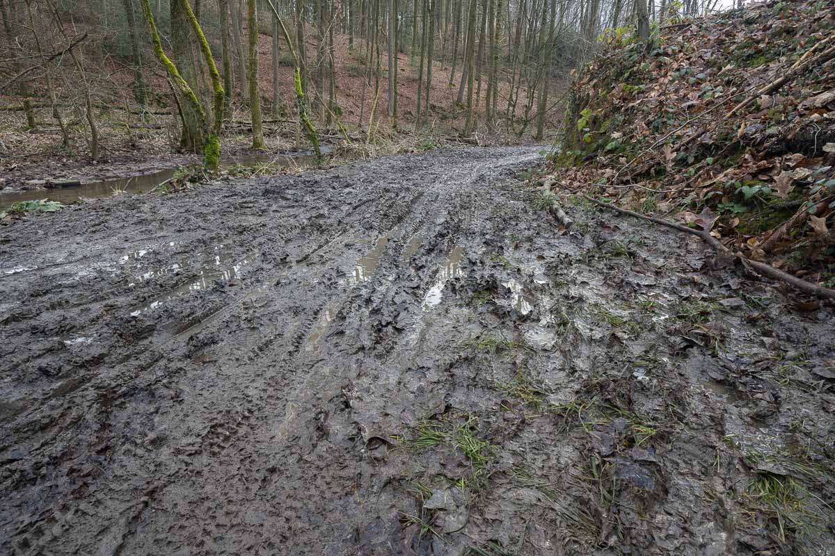 Kurz vor Hülstrung verließ ich dann den Obstweg und wanderte nach Bergerhof. Dort nahm ich dann Weg durch das Schmerbachtal. Beim Abstieg in das Tal wurde es sehr matschig. Auch das wurde in Bild fest gehalten, wobei erneut gestackt wurde. Dieses Mal zeige ich 2 der Einzelbilder um zu zeigen das bei Blende 4 die Tiefenschärfe nicht ausreicht. Blende 4 wurde gewählt weil das Objektiv dort seine größte Abbildungsleistung „sweet spot“ hat. Das Bild hätte man auch mit dem 14-30 mm Zoom machen können, bräuchte dann aber mindestens Blende 16. Wegen Beugungseffekten nimmt dabei die Gesamtschärfe deutlich ab.