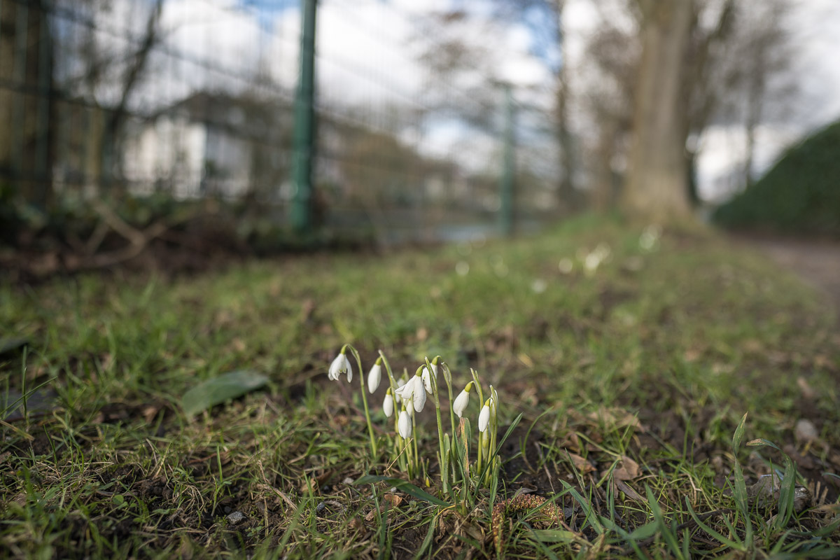 Die ersten beiden Bilder entstanden kurz nach meinem Start in Leichlingen auf dem Wupper-Begleitweg. Natürlich war ich darauf aus die Vorteile des Objektives zu suchen. Die liegen nun mal in der höheren Lichtstärke die es ermöglicht den Vordergrund vom Hintergrund zu trennen und ein Objekt in seiner Umgebung zu zeigen. Also : Blende auf und nah ran! Da kamen mir die ersten Schneeglöckchen und die Info-Tafel gerade recht.