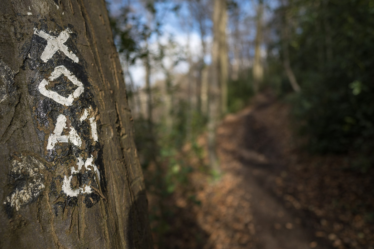 Wegen der kurzen Brennweite muß man da sehr nah ran, bei obigen Beispiel waren es in etwa 50 cm. Bei Blende 1,8 ist die Tiefenschärfe hier so gering, das nur der mittlere Teil der auf dem Baustamm gewölbten Markierung scharf ist.