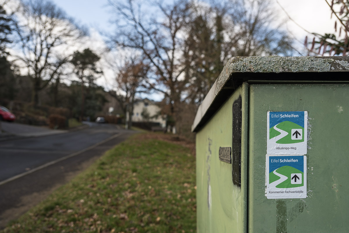 Die Anfahrt in die Voreifel ging glatt und ohne Stau vonstatten. Bei Kommern gab es allerdings auf der B 266 eine Baustelle und ich konnte nicht durch die vom Navi vorgeschlagene Abfahrt in den Ort gelangen. War aber kein Problem, ich nahm hinter dem Ort die erste Gelegenheit zur Abfahrt und gelangte in die Mühlengasse wo ich an der dritten Abbiegung nach rechts einen Parkplatz fand. Von dort startete ich meine Rundwanderung durch die Gielsgasse entgegengesetzt zum Uhrzeigersinn.