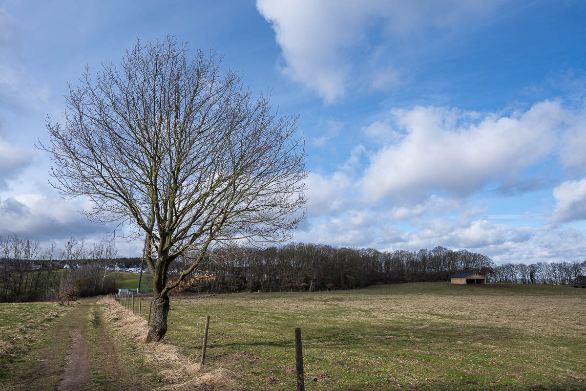 Über weitgehend freies und auch windiges Gelände erreichte ich das kleine Örtchen Schaven wo es eine schöne Kapelle von außen zu besichtigen gab. Alles in allem wurden die Wolken jedoch mehr, die Sonne weniger und der Wind nahm zu. So war ich froh als ich wieder in Kommern ankam und über die Kölner Strasse mit einigen weiteren schönen Fachwerkhäusern zu meinem Parkplatz gelangte.