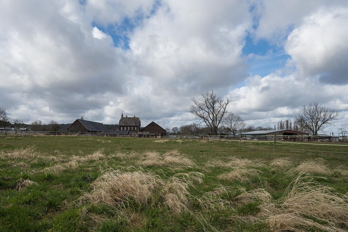 Gleich zu Beginn machte ich einige Bilder von den schönen Fachwerkhäusern. Dabei blieb das von mir mitgenommene 20-mm Weitwinkelzoom zunächst noch im Rucksack. Es war noch recht frisch, aber die Sonne wärmte doch schon so langsam wenn sie zwischen den Wolken hervor lugte. Erstaunlicherweise waren zahlreiche Spaziergänger unterwegs, die meisten mit Hund. Bei einer Gassigeherin erkundigte ich mich nach den hiesigen Sturmschäden. Sie mußte am Morgen lediglich einige Äste vor der Garage entfernen, ansonsten sei der Ort wohl verschont geblieben.