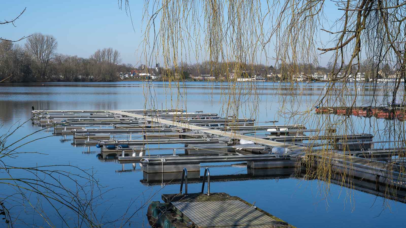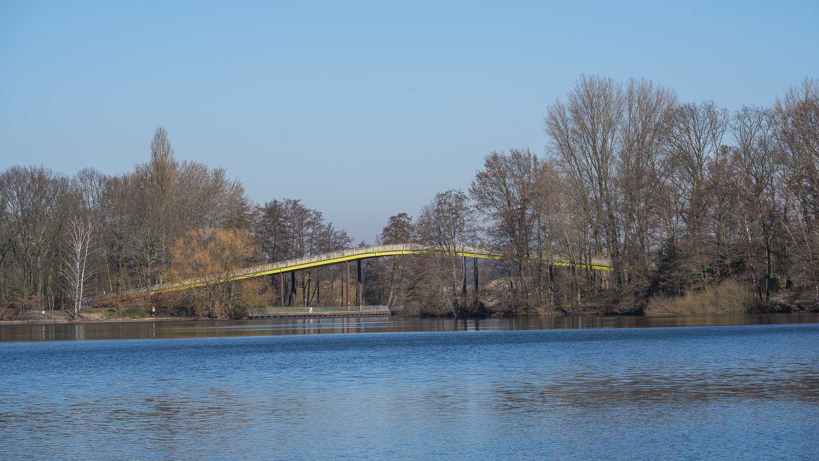 Am Ende der Straße „Am See“ tauchte dann die Baustelle an der Masurenallee auf und mir wurde klar warum ich bei der Anfahrt diese Probleme hatte. Der Wanderweg ging dann rechts ab entlang des Masurensees. Hier gibt es im nördlichen Teil einen Bootshafen und im Süden einen Yachthafen. Dort lagen einige Segelboote deren Masten der Grund für die hohe Fußgängerbrücke sind. Die müssen da drunter durch wenn sie den Masurensee verlassen wollen.