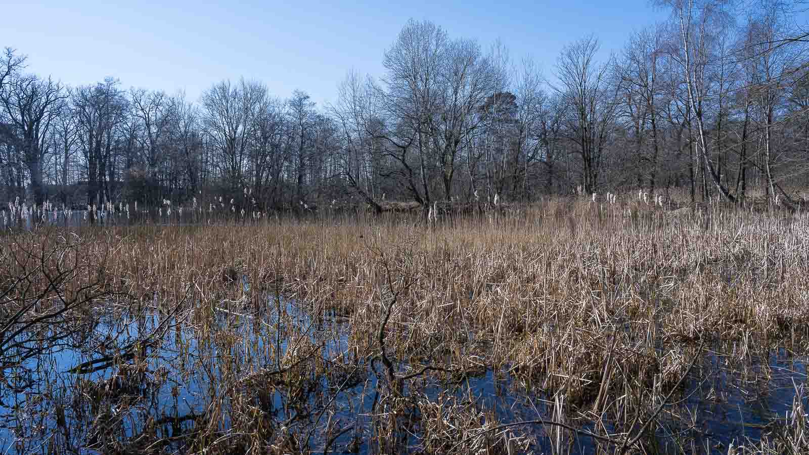 Wir starteten unsere Runde entgegengesetzt zum Uhrzeigersinn und überquerten zunächst die B56 um in das Naturschutzgebiet Gagelbestand zu gelangen. Die Gegend hier ist ganz flach ohne jegliche, erkennbare Steigung. Der breite Wanderweg ist wegen des morastigen Geländes meist links und rechts mit einem Entwässerungsgraben versehen. In dem Gebiet gibt es zahlreiche Teiche die offensichtlich aufgrund ihres wie mit dem Lineal gerade gezogenen Uferverlaufs nicht natürlichen Ursprungs sein können. Einige davon waren ausgetrocknet bzw. sind wohl nur bei höherem Wasserstand befüllt.