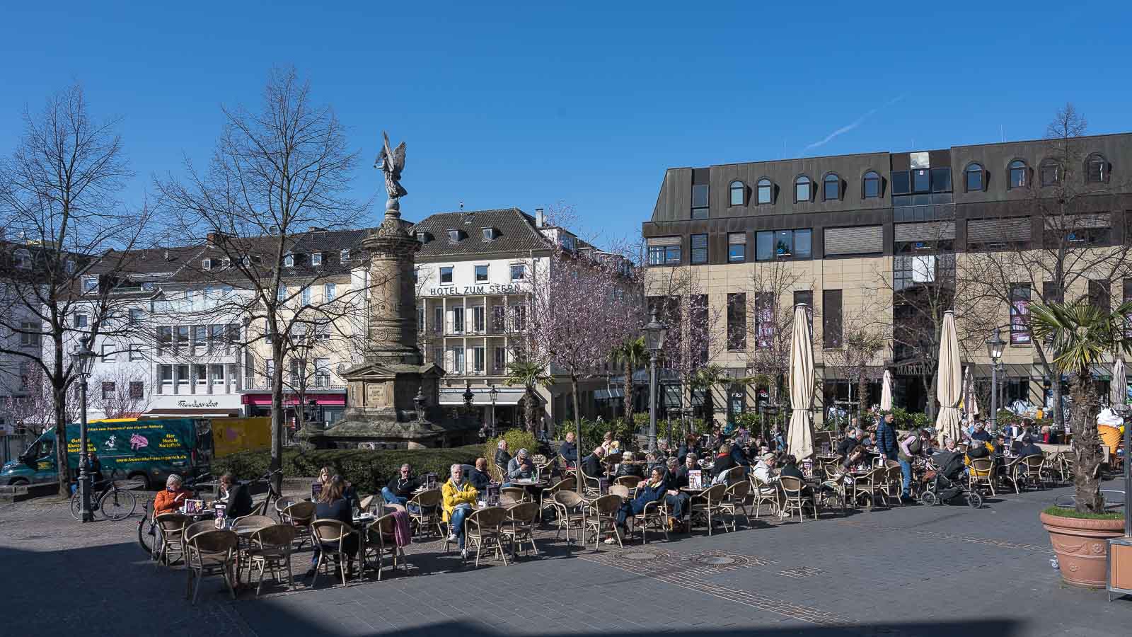 Die Altstadt am Markt gefiel uns beiden sehr gut. Da ich es mir in den Kopf gesetzt hatte den Michaelsberg zu besteigen um von oben die Aussicht zu genießen, hielten wir uns hier nur kurz auf und marschierten bergauf. Es gibt dort zahllose Fußwege die von der Bergstraße aus abgehen. Wir kamen auch oben an, aber der vorgesehene Rundweg entlang des Bergfriedes war wegen einer Baustelle gesperrt. Auch das oben befindliche Restaurant hatte geschlossen. Wegen Corona öffnen die derzeit nur am Wochenende. Trotzdem fanden wir oben noch ein sonniges Bänkchen für unsere Mittagspause.