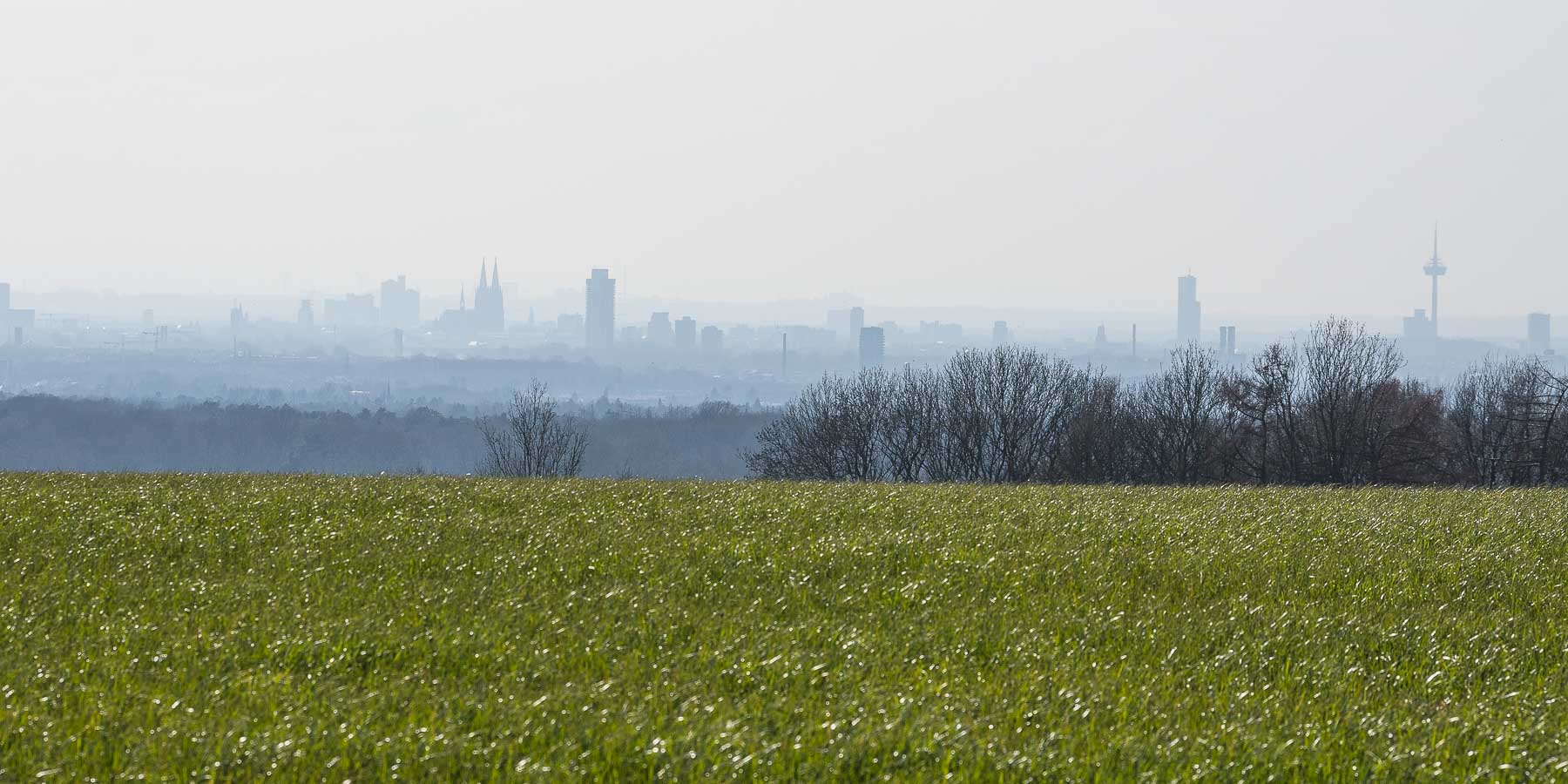 Oben angekommen geht es wieder über offenes Gelände. Kurz vor Uppersberg hat man eine schöne Aussicht und kann in der Ferne den Kölner Dom und einen Teil der Sky Line erkennen. Hinter Upperberg geht es dann bergab in das Tal der Dhünn.