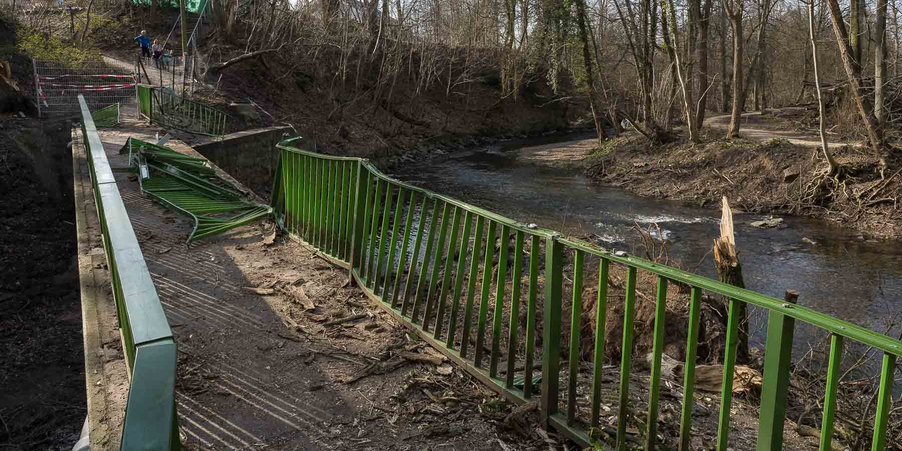 Frisch gestärkt gelangten wir nach der Überquerung einer weiteren Gaspipeline Baustelle und Durchquerung eines kleinen Wäldchen wieder zur Dhünn. In Schlebusch mußten wir einen kleinen Umweg machen da eine Fußgängerbrücke über einen Nebenbach durch einen umgestürzten Baum stark demoliert worden war. Die Strecke die wir umkehren mußten habe ich im Treck mal drin gelassen. Wenn man von vorne herein die Umgehung nimmt so wird die Wanderung etwa 800 m kürzer.