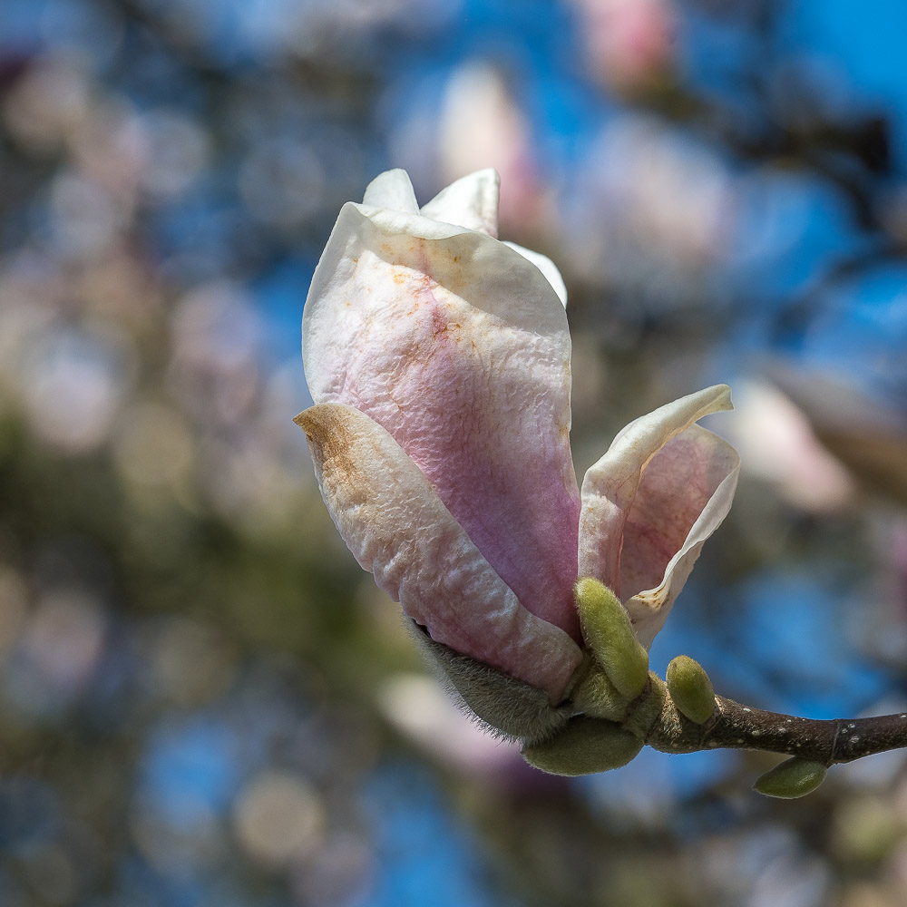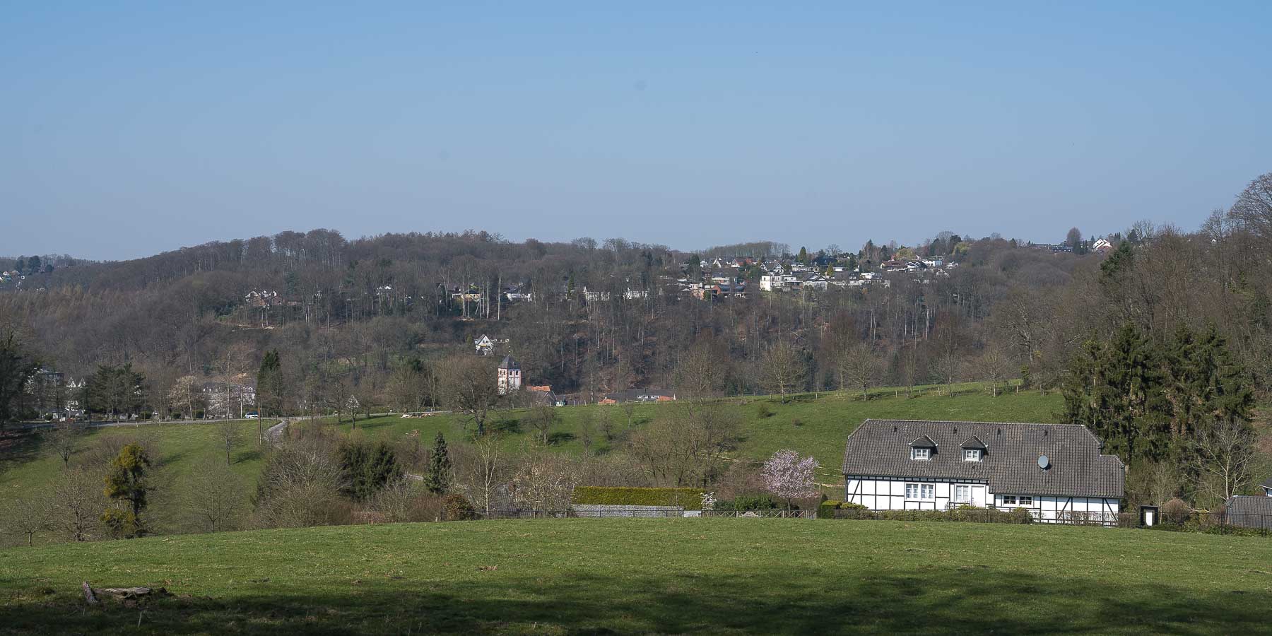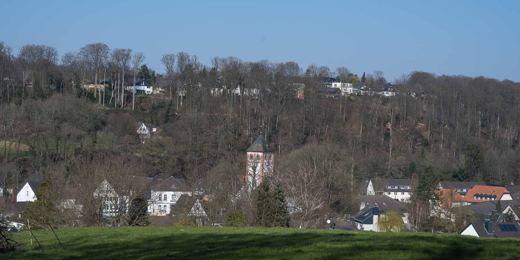 Wir liefen die Runde entgegengesetzt zum Uhrzeigersinn. Nachdem wir in Odenthal die ersten blühenden Magnolienbäume fotografiert hatten, verließen wir den Ort und wanderten durch ein lichtes Wäldchen zum Friedhof von Selbach. Unterwegs hatten wir bereits erste schöne Aussichten auf Odenthal und auf Glöbusch auf dem gegenüberliegenden Hang.