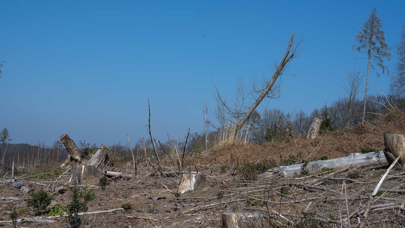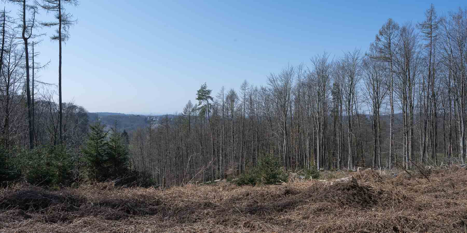 In Selbach ging es vorbei an einigen gackernden Hühnern und zwei Kühen, davon ein beachtlicher Bulle, wieder in den Wald hinein. Die Wälder um Odenthal waren deutlich vom Borkenkäfer geschädigt. Die meisten befallenen Bäume wurden mittlerweile beseitigt und auch abtransportiert. Daher gab es unterwegs viele Brachflächen im Wald.