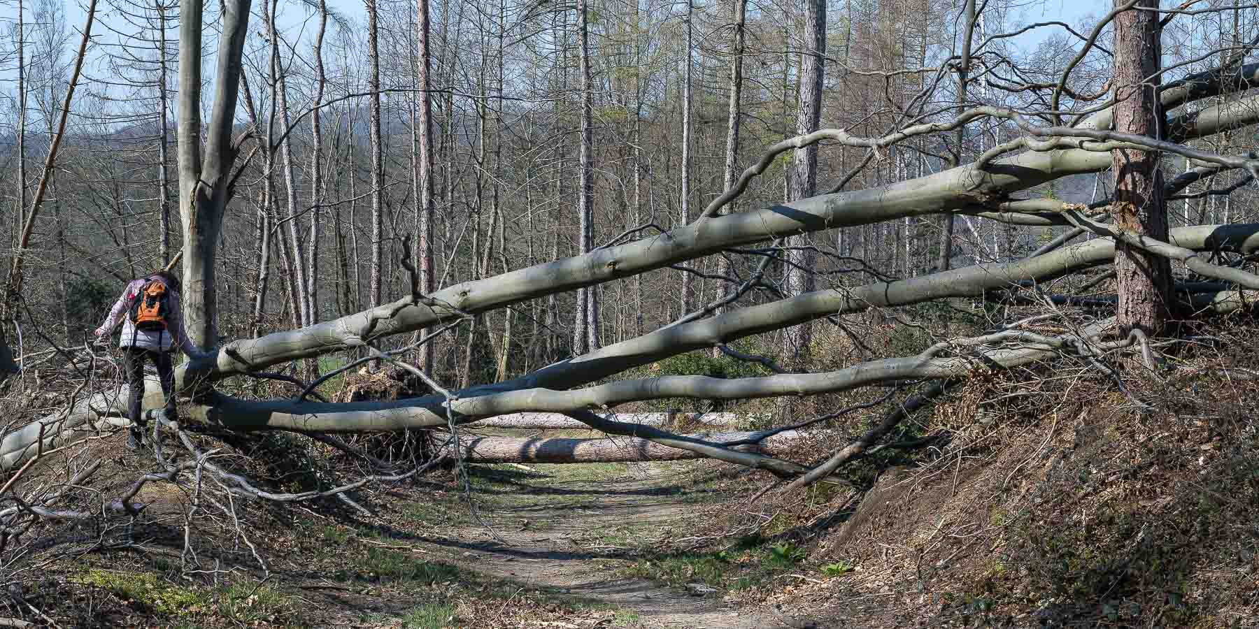 Auch die letzten Stürme hatten ihre Spuren hinterlassen und zwangen uns zur ein oder anderen Kletter- bzw. Krabbeleinlage. Kurz bevor wir wieder in Odenthal ankamen passierten wir einen Trostwald in dem Begräbnisse stattfinden können. Wir nahmen uns einen Prospekt mit. Man weiß ja nie was da noch so alles auf einen zukommt ……