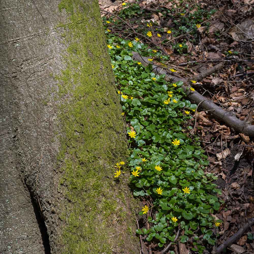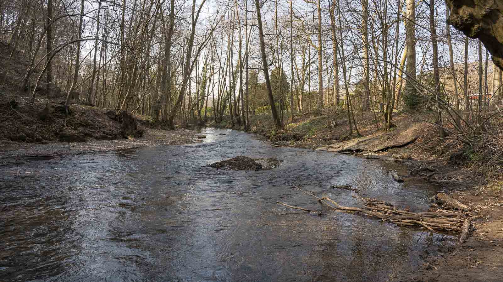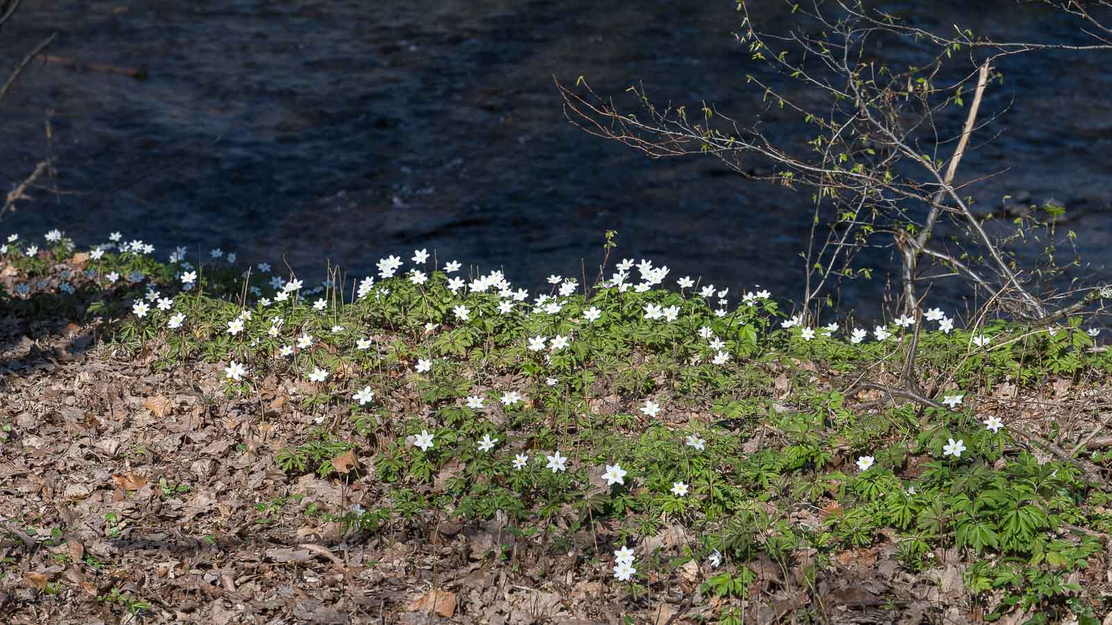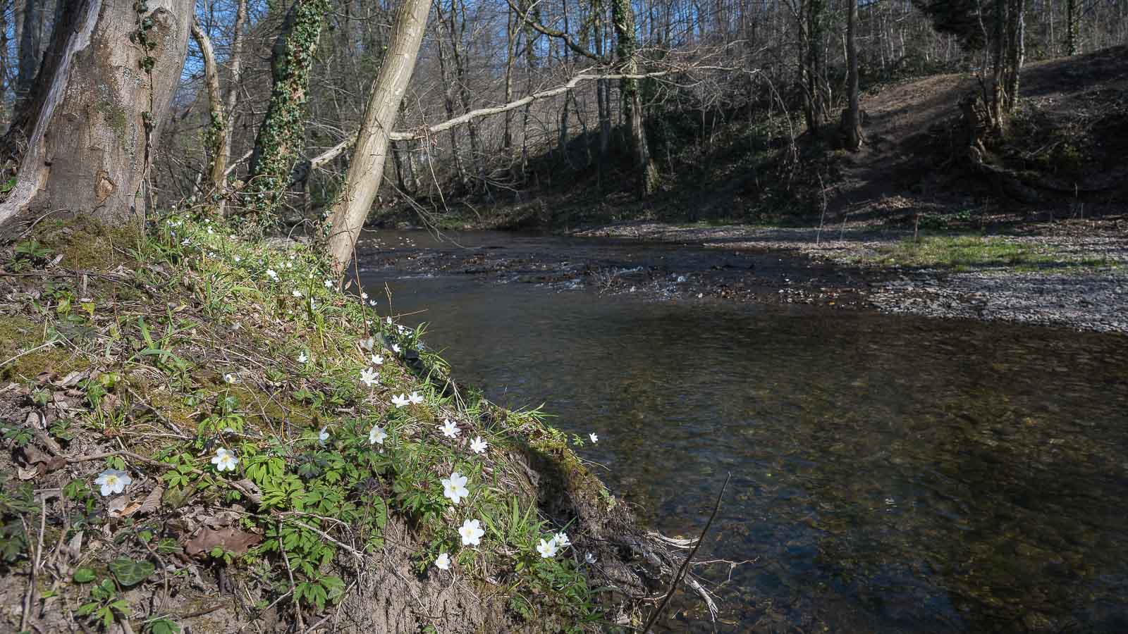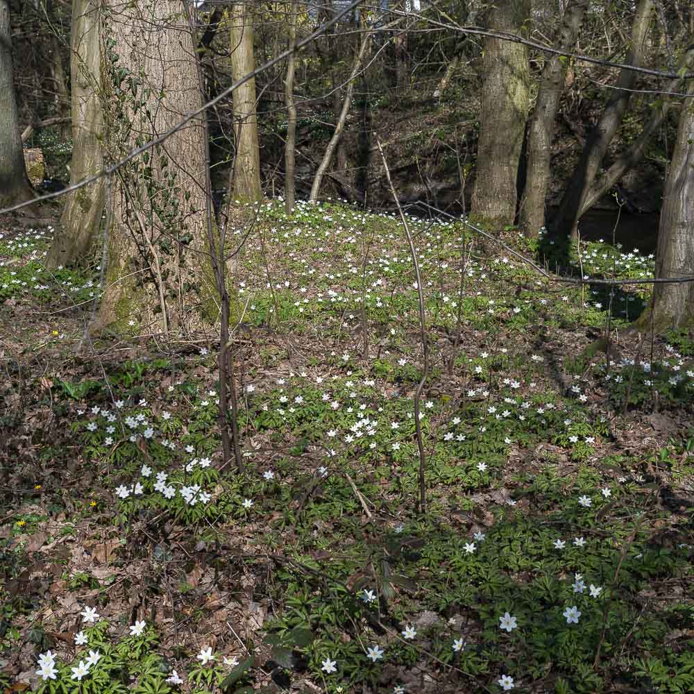 Am Ortseingang von Odenthal überquerten wir dann die viel befahrene Landstraße und liefen geradeaus weiter zur Dhünn. Dort blieben wir bis zu unserem Parkplatz. Auf diesem Teilstück hatte ich Gelegenheit einige Bilder von den derzeit blühenden Buschwindröschen zu machen. Die wuchsen hier in richtigen Blütenteppichen.