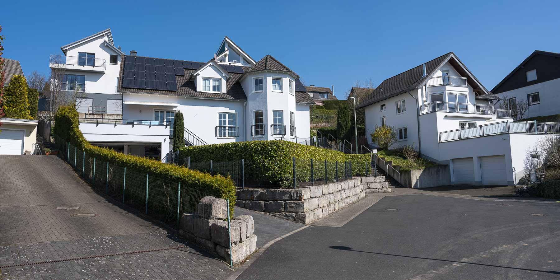 Am Mühlenweg sahen und fotografierten wir noch ein schönes Fachwerkhaus bevor wir nach links in den Steiner Siefen abbogen und bergauf nach Glöbusch wanderten. In Glöbusch ging es einen geschätzten Kilometer durch die Wohnsiedlung mit ihren recht stattlichen Einfamilienhäusern.