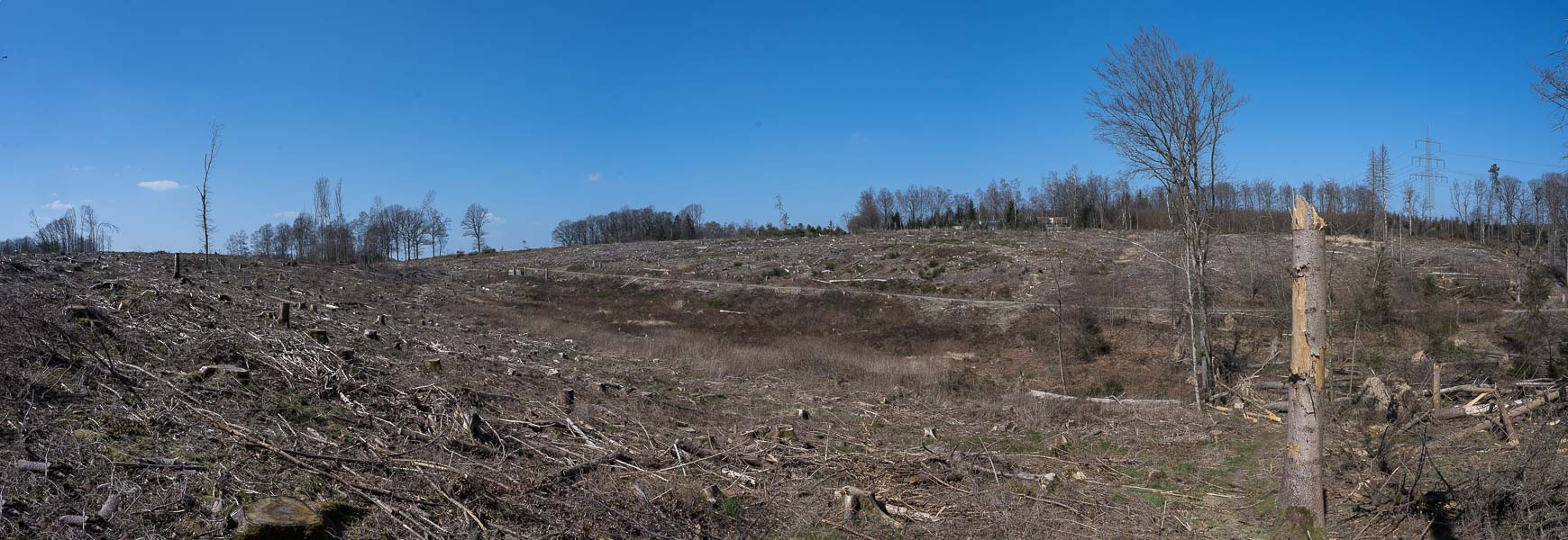 Was ich ebenfalls noch nicht gesehen hatte ist so etwas wie der ehemalige Wald zwischen Graben und Buchholz. Hier ist das zuvor gezeigte Panoramabild entstanden. Der gesamte Fichtenwald wurde hier durch den Borkenkäfer vernichtet und mußte anschließend abgeholzt werden. Einige wenige Laubbäume sind wohl zunächst noch stehen geblieben, wurden dann aber von den letzten starken Stürmen umgepustet. So wurde ich dann zu einigen Kletter- bzw. Krabbeleinlagen gezwungen.