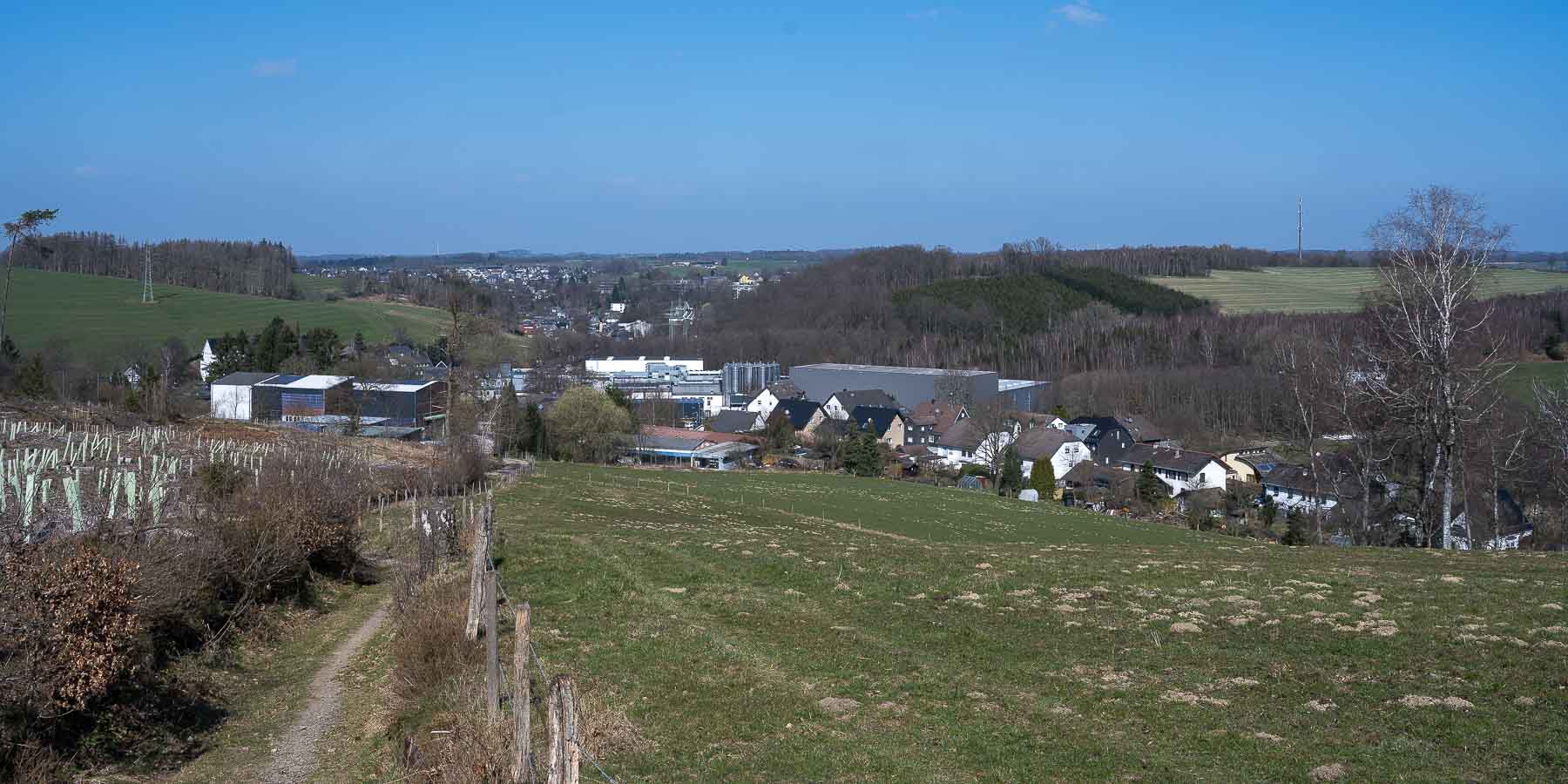 In Niedergaul verließ ich dann das Gaulbachtal und wanderte bergauf in Richtung Agathaberg. Dabei gab es erneut schöne Aussichten über das Bergische Land. Von Agathaberg ging es weiter nach Fähnrichsstutten. Hier sah ich dann zum zweiten mal Werksanlagen einer Fa. Jockey. Ich dachte dabei an den Hersteller der Unterwäsche. Beim Schreiben dieses Beitrages schaute ich dann doch noch mal nach. Es handelt sich demnach um einen Hersteller von Spritzguss Anlagen. Beim vorbei Wandern an den beiden, einen pico-bello Eindruck machenden Werksanlagen hatte ich mich schon gefragt wofür man denn zur Herstellung von Herrenunterhemden derartig viele Silos und Lösungsmitteltanks braucht.