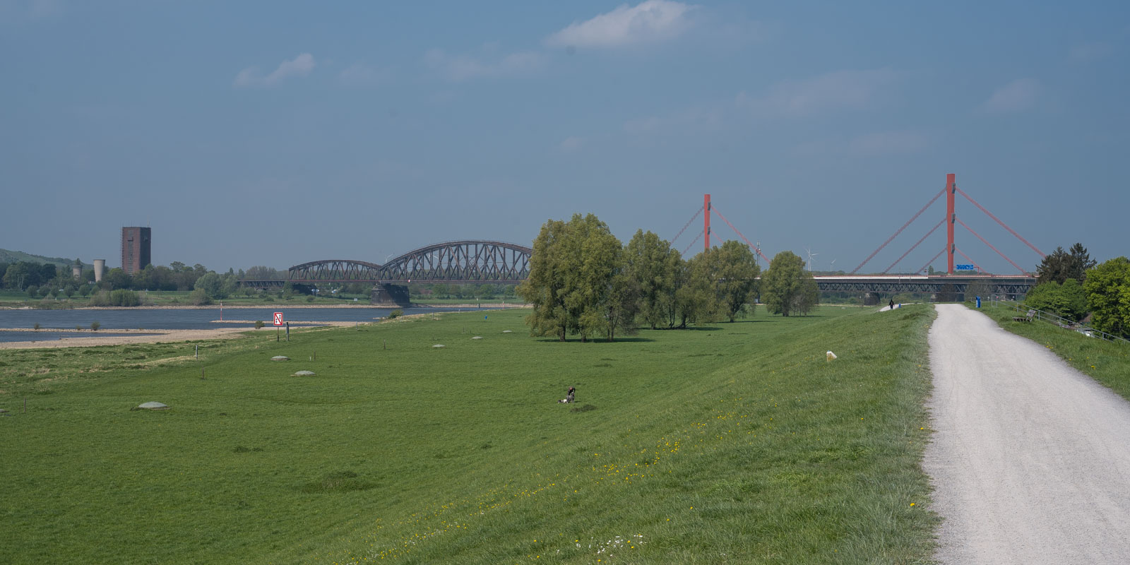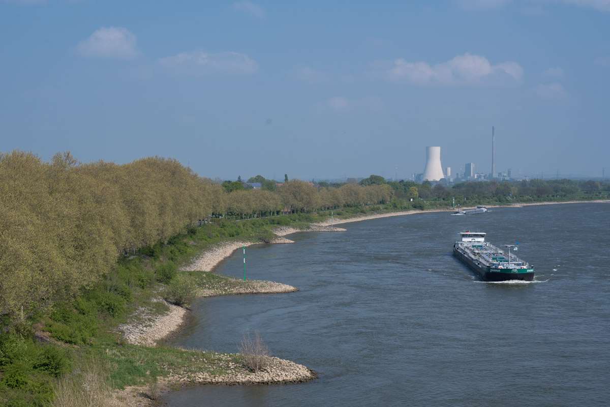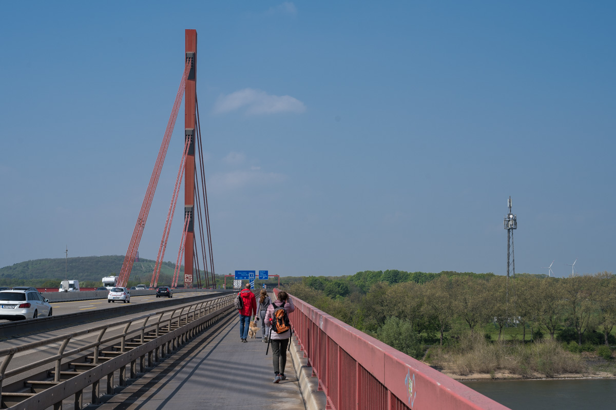 Wie so oft war es auch dieses Mal am Rhein windig und recht frisch. Das Wetter war zwar sonnig, teilweise aber auch etwas diesig. Also nicht unbedingt das beste Fotowetter. Unterwegs sahen wir einen Storch der hier seine Kreise zog, für ein Bild leider viel zu weit weg. Wir genossen die Aussicht über die weite Landschaft und wanderten immer weiter stromab. Ziel war die Brücke der A40 über den Rhein. Da mußten wir auf die andere Seite. Vorher aber ging es noch unter einer Eisenbahnbrücke hindurch.