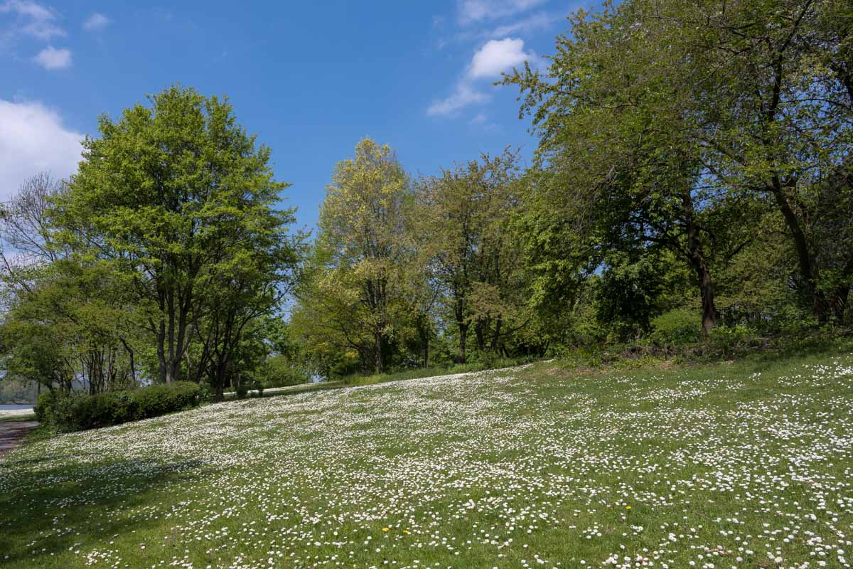 Dieser wurde einem Freizeitgelände umgestaltet und kann rundum in Ufernähe begangen werden. Wir suchten uns eine schöne Bank auf der es nicht so windig war wie am Rhein und machten dort unsere Mittagspause. Dem Track des Führers folgend hätten wir den gleichen Weg zurück an den Rhein machen müssen. Wir zogen es aber vor, noch ein Stückchen weiter am See entlang zu schlendern. Für den Rückweg fanden wir eine Strecke durch den Ortsteil „In den Haesen“ der größtenteils durch Parkanlagen verlief. Kurz hinter einem Freibad, das kannte Petra noch aus ihrer Kinderzeit, fanden wir dann wieder zurück auf den vorgeschlagenen Track.