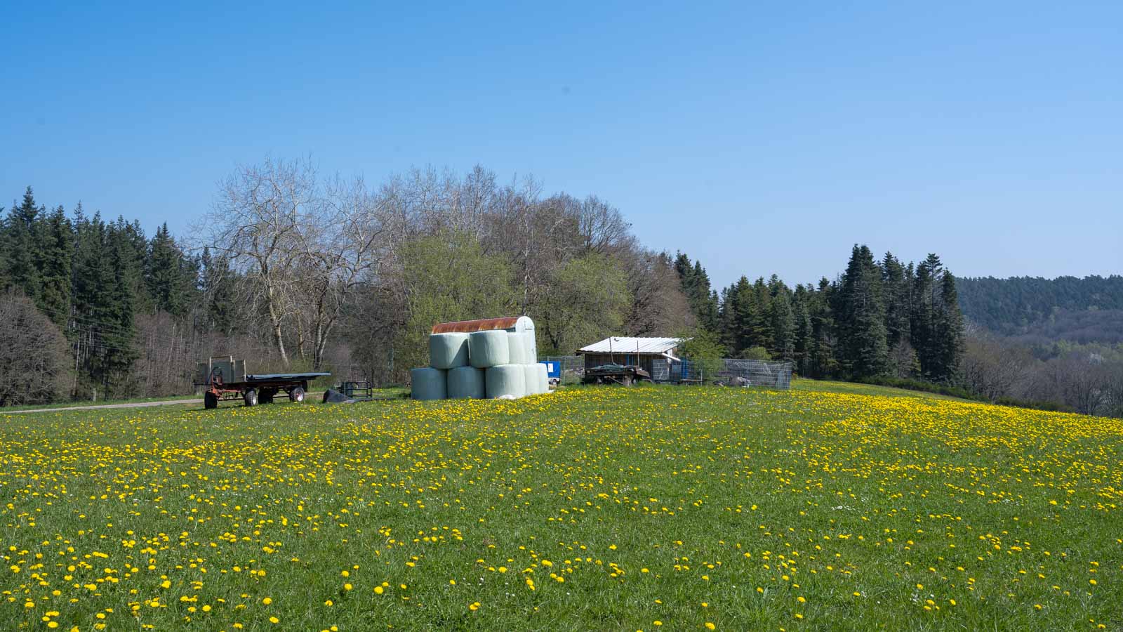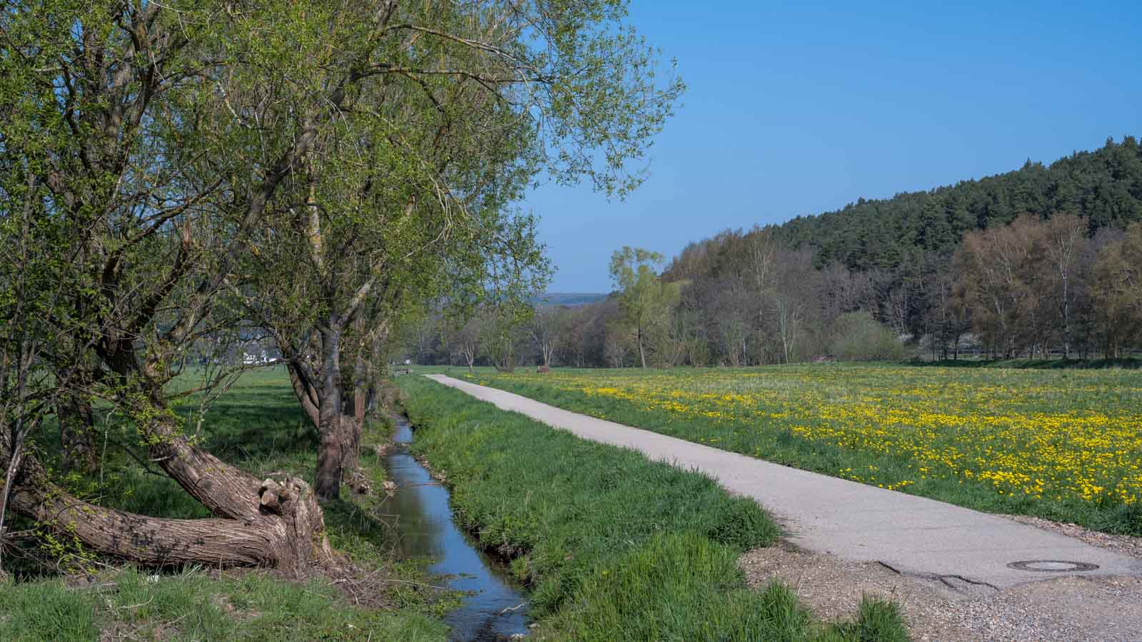 Hinter der Brücke über die Urft ging es noch etwas über offene Wiesenlandschaft die von zahlreichen blühenden Löwenzähnen gelb eingefärbt war.