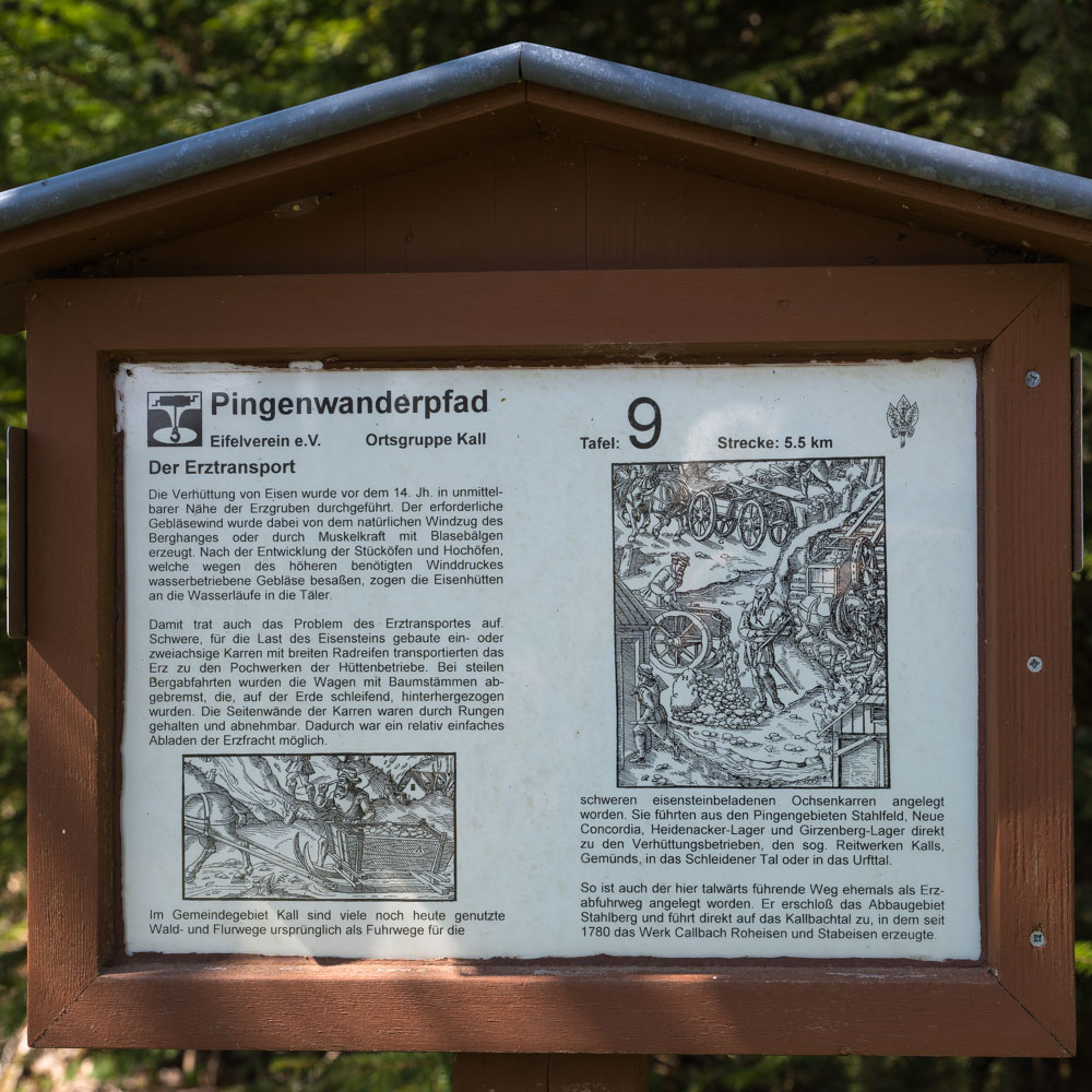 Wie bei den Eifelspuren bzw. Eifelschleifen üblich war die Beschilderung bestens und die Strecke kann zur Not auch ohne Wandernavi begangen werden. Unterwegs gab es zahlreiche Infotafeln über den Bergbau der in dieser Gegend schon seit Römerzeiten betrieben wurde.