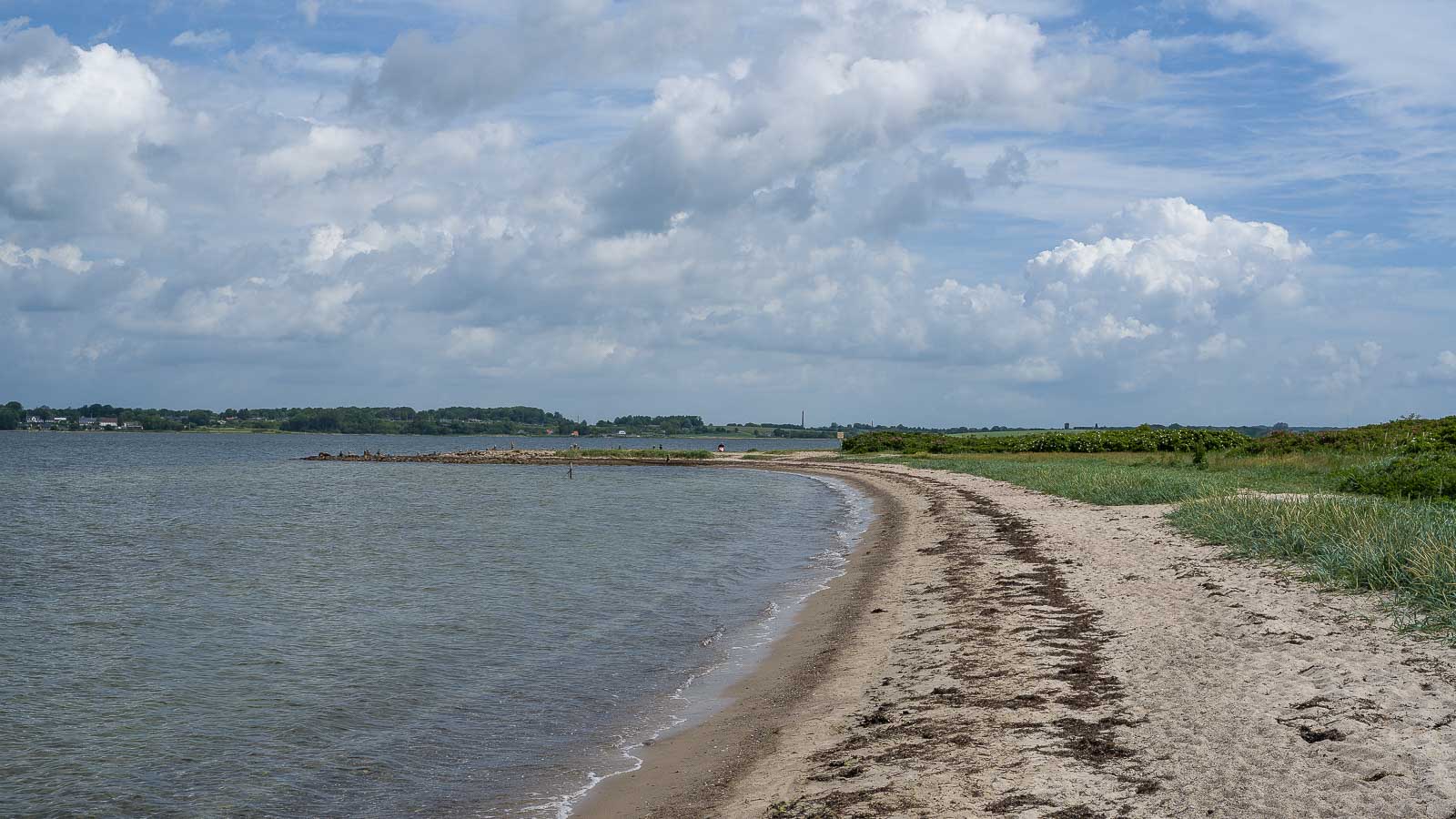 Auf der Ostseite der Insel angekommen sahen wir einige Einkehrmöglichkeiten. Eine davon nutzten wir für den verspäteten Cappuccino den ich Petra versprochen hatte. Auf der Ostseite befindet sich der Hauptbadestrand der Halbinsel. Das Wasser hier ist sehr flach und daher wohl wärmer als für die Ostsee üblich. Zumindest sahen wir einige Kinder die darin herum planschten. Die konnten fast 100 m raus laufen und waren immer noch nur bis zu den Knien im Wasser (laut „Dr. Google“ betrug die Wassertemperatur in Kiel 13 °C, an anderen Orten der Ostsee nicht mehr als 16°C). Die meisten Wassersportler waren Wind-Surfer in Neopren Anzügen.