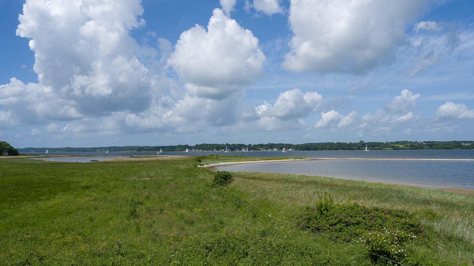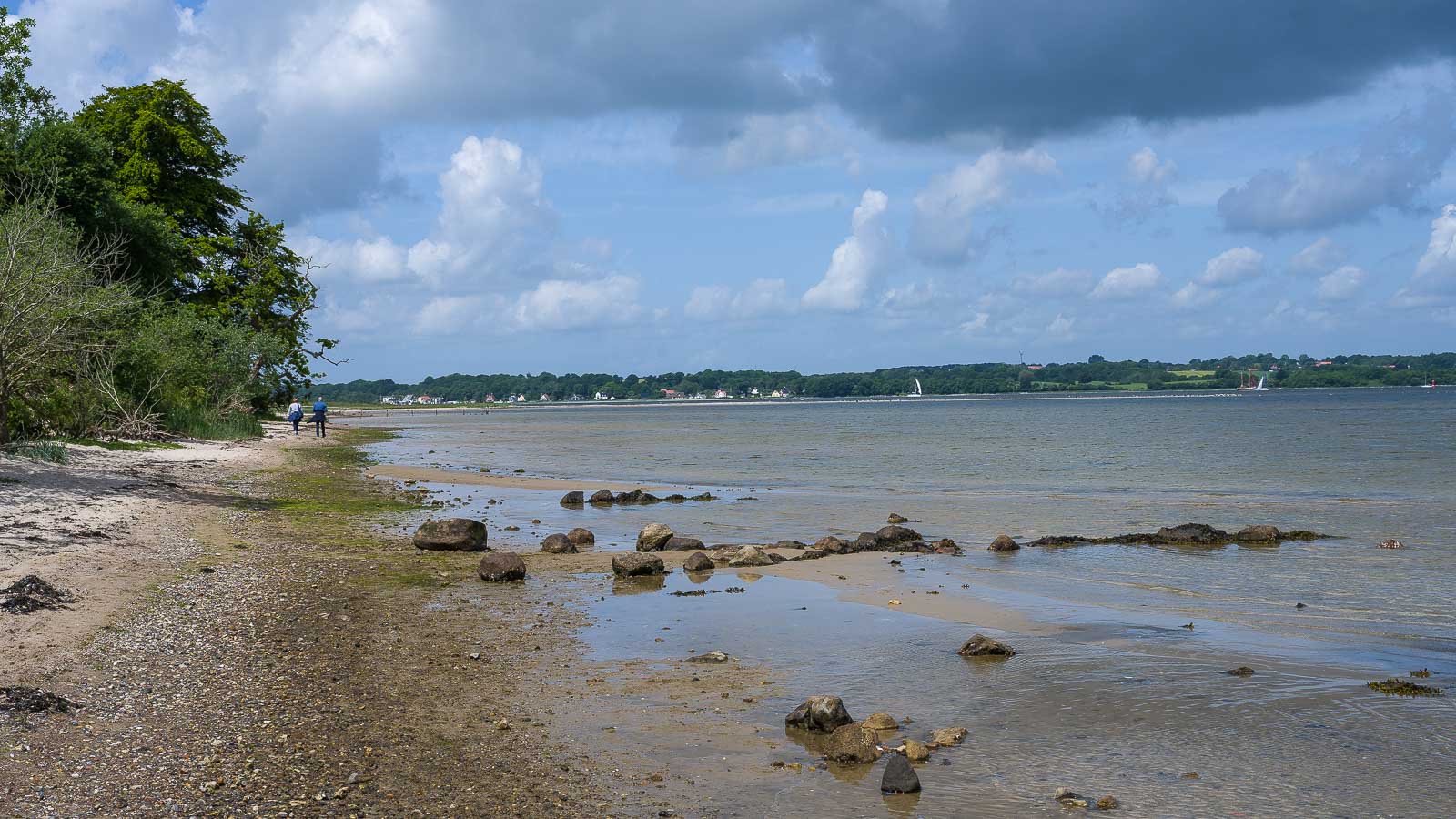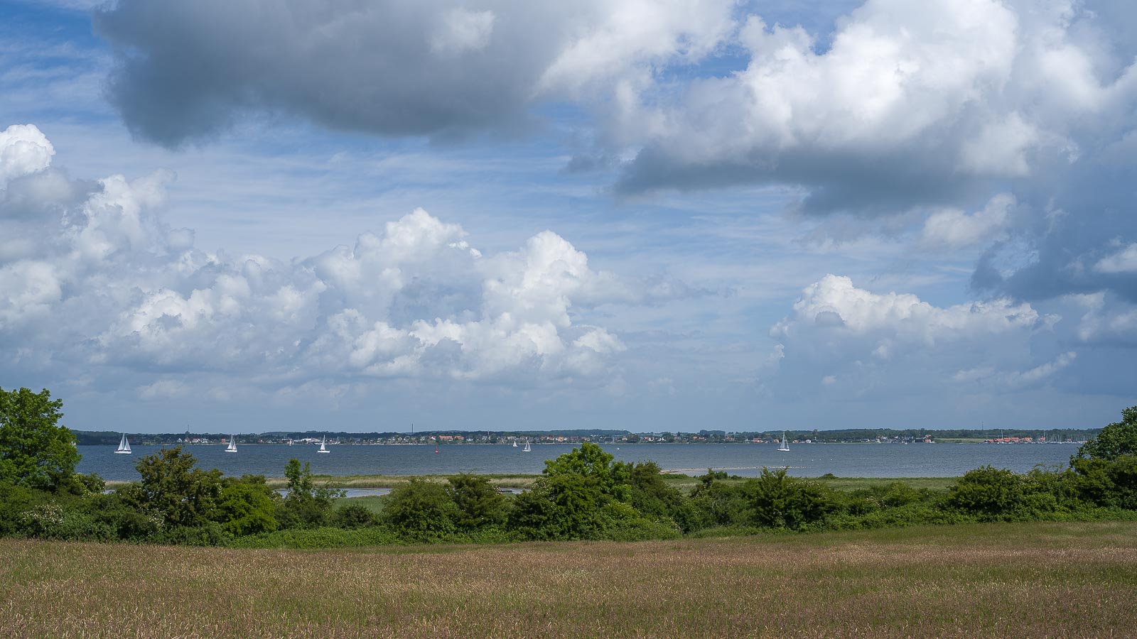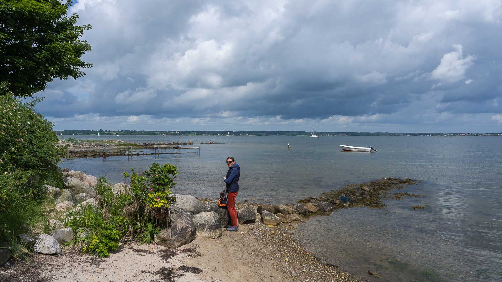 Auf der Flensburger Förde waren zahlreiche Segelboote unterwegs. Eine Segelschule war auch dabei. Mit knatternden Segeln übten die ihre Wendemanöver. 30 Segelboote zählte ich während unserer Pause.
