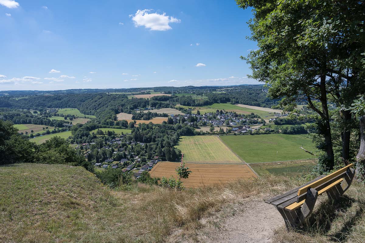 Im Wald fanden wir eine der wenigen Bänke der Wanderstrecke und machten eine Pause in der wir unsere Marschverpflegung verzehrten. Unterwegs gibt es keine Einkehrmöglichkeiten. Eine auf meiner Open-Street-Map verzeichnete Gaststätte in Hohn hatte geschlossen und auch das Café in der Orangerie des Schlosses Merten hat dauerhaft zu.