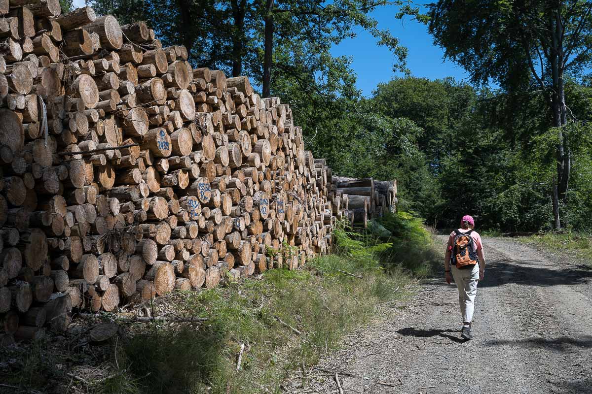 Die folgende Wanderung ging durch Waldgebiet welches überwiegend aus Laubbäumen bestand und daher kaum vom Borkenkäfer befallen war. Nach 6 km erreichten wir den höchsten Punkt der Runde (250 m). Wir bogen hier von einem naturbelassenem Forstweg nach rechts ab auf eine kleine, asphaltierte Straße die uns nach Hohn brachte. Hier führte der Track des Wanderführers über einen Privatweg und eine resolute Dame vertrieb uns dann auch prompt von dort und wir mußten weiter der Strasse folgen. Nach insgesamt 2 km Asphalt waren wir froh als wir wieder nach rechts auf einen Forstweg abbiegen konnten.
