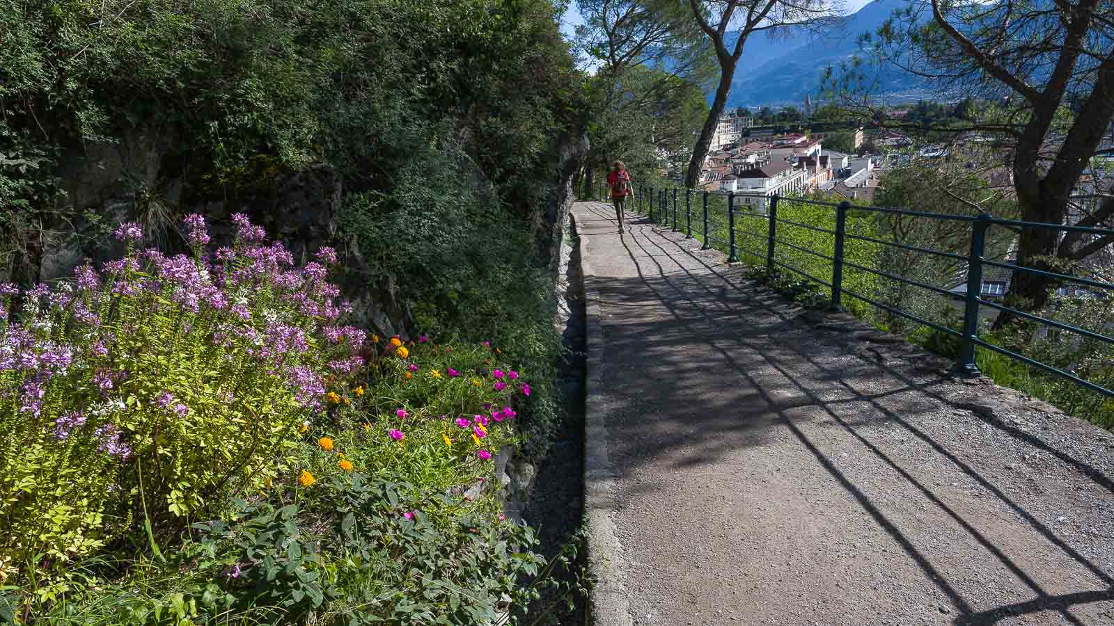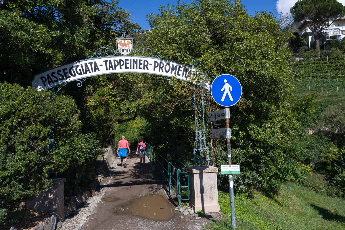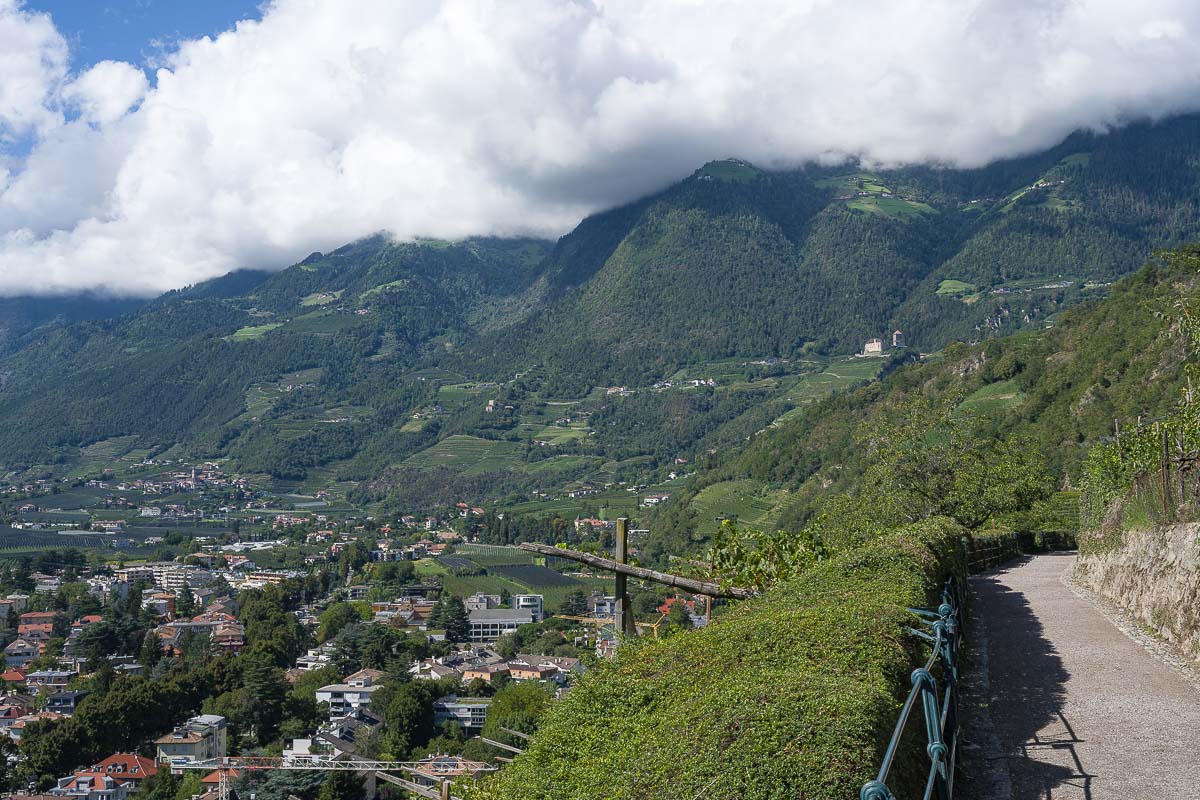 Direkt daneben startet der Weg. Den Höhenunterschied bewältigt man bequem in lang gestreckten Kehren in denen es gemächlich bergauf geht. Der Weg kann gut mit Kinderwagen, Rollator oder Rollstuhl bewältigt werden. Schön das es in Meran auch einen behinderten gerechten Wanderweg gibt. Ist man erst mal oben angekommen so geht es nur noch gerade aus.