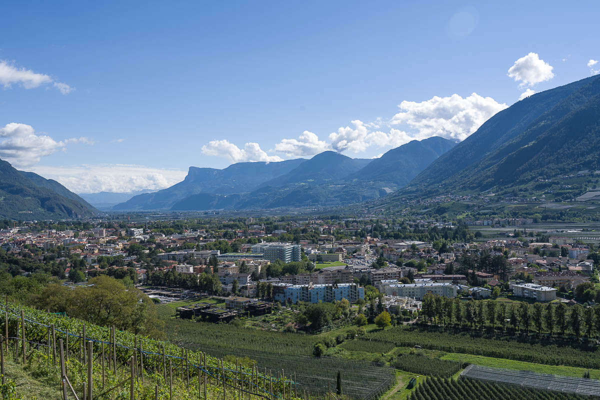 Eine längere Anfahrt kam wegen der fortgeschrittenen Stunde nicht mehr in Frage und so machten wir uns auf nach Meran. Dort wollten wir den Tappeiner Weg wandern. Dieser wurde auf Veranlassung des Meraner Arztes Franz Tappeiner angelegt. Er verläuft etwa 100 m oberhalb des Talkessels und bietet eine schöne Aussicht in das Etsch Tal. Er startet direkt neben der Talstation der alten Seilbahn nach Dorf Tyrol.