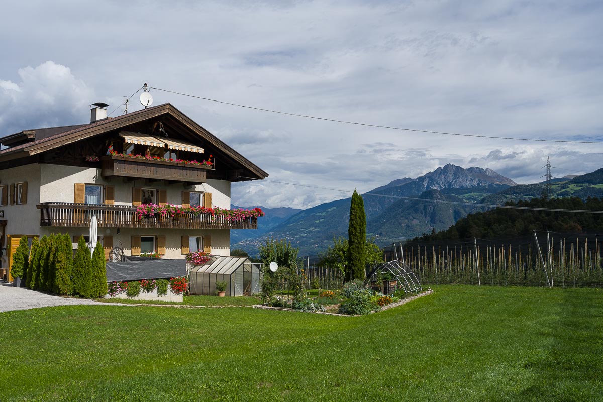 Aus meinem Rother Wanderführer hatte ich daher die Nr. 34 raus gesucht. Sie führt von Völlan oberhalb von Lana zur St. Hippolyt Kapelle. Wir starteten für unsere Verhältnisse recht früh, trotzdem gab es wegen des Samstags doch schon einiges an Rückreiseverkehr. In Vollan parkten wir, wie vom WF vorgeschlagen, am Vereinshaus und ergatterten dort den letzten freien Parkplatz.