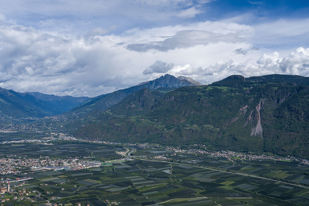 Am tiefsten Punkt angekommen, wanderten wir dann weiter durch ein kleines Wäldchen zurück in das Obstanbaugebiet und von dort über die Obermühle zurück nach Völlan. Der Wettergott war wieder mit uns, die ganz plötzlich auftauchenden dunklen Wolken brachten nur einige wenige Tropfen und wir erreichten trockenen Fußes unseren Wagen.