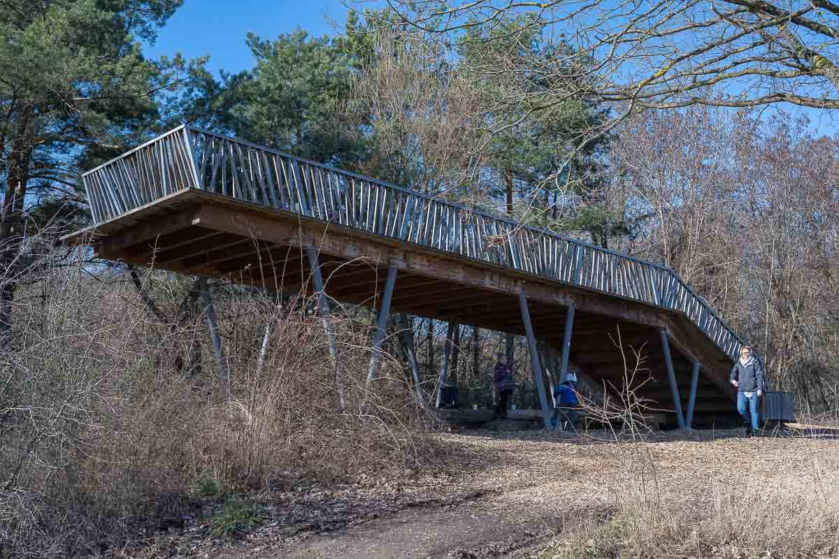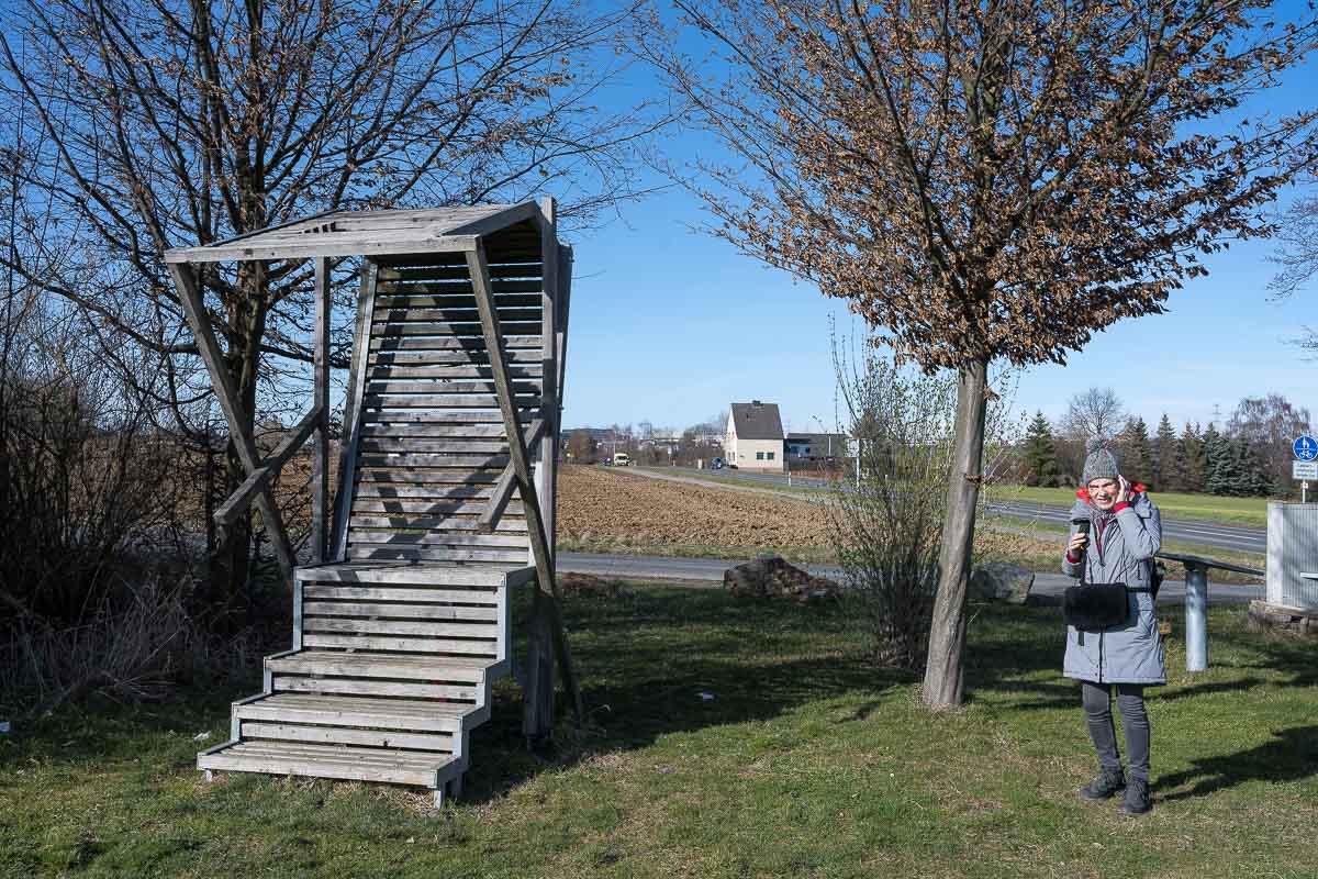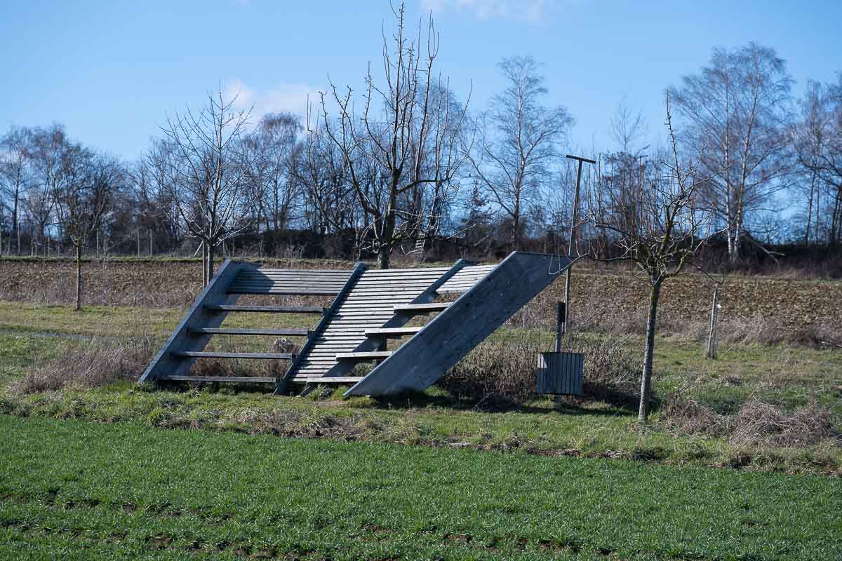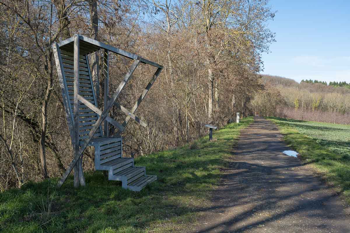 Am Birnenweg sind einige interessante Holzkonstruktionen aufgestellt. Die wurden im Rahmen eines Wettbewerbes von Studenten der Hochschule Trier angefertigt. Eine davon nutzen wir für unsere Mittagspause. Für Bienenliebhaber interessant sind noch verschiedenen Schautafeln die über diese nützlichen Tiere informieren.