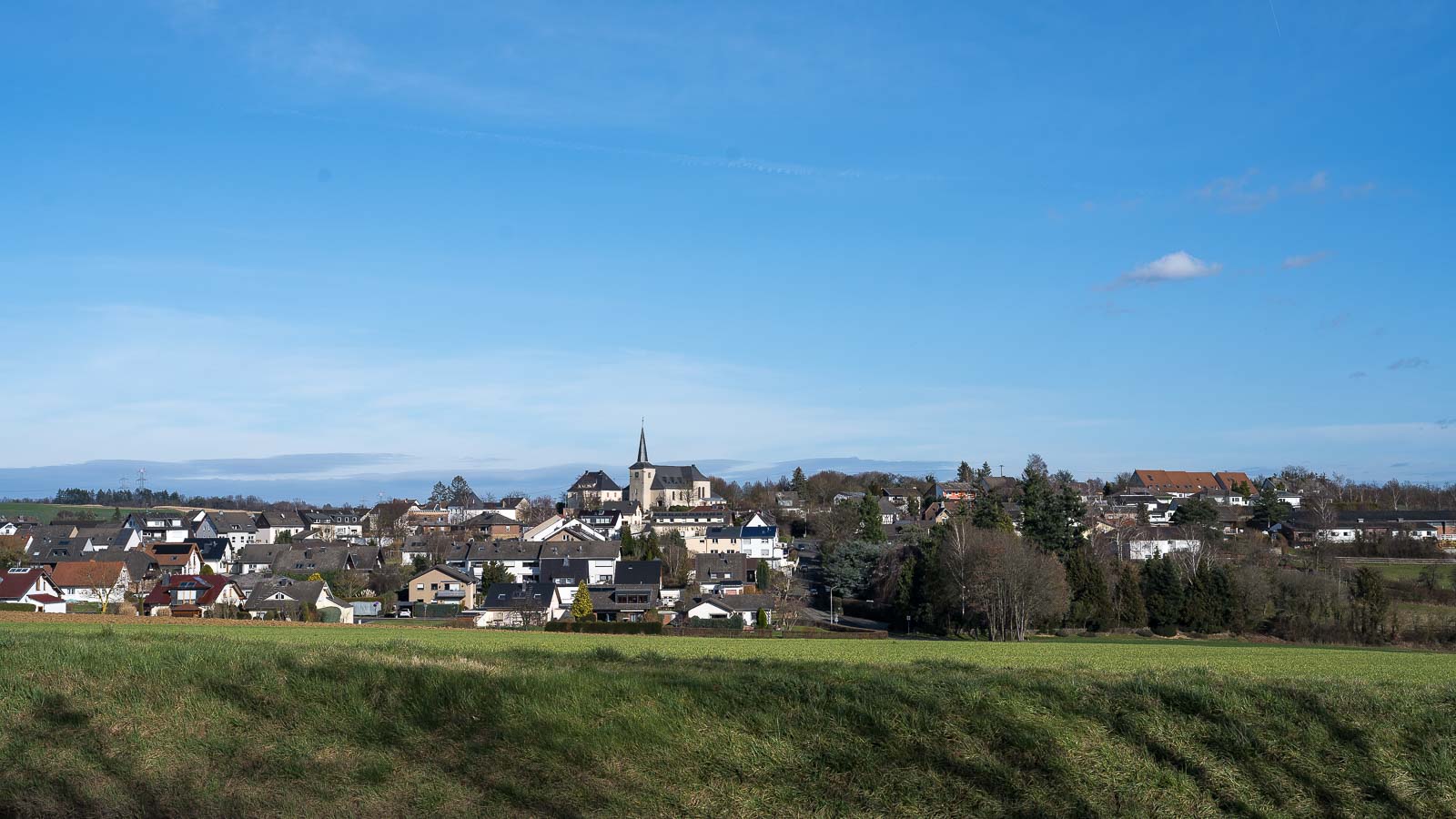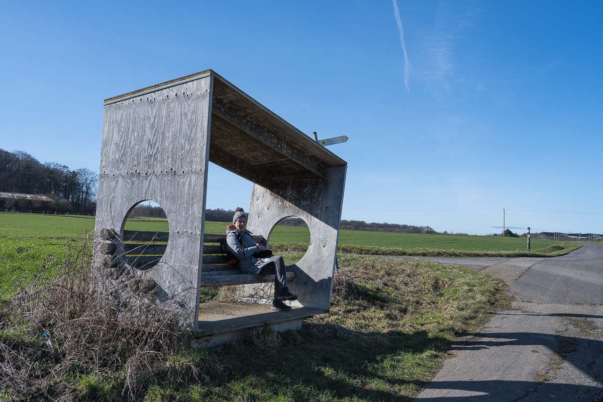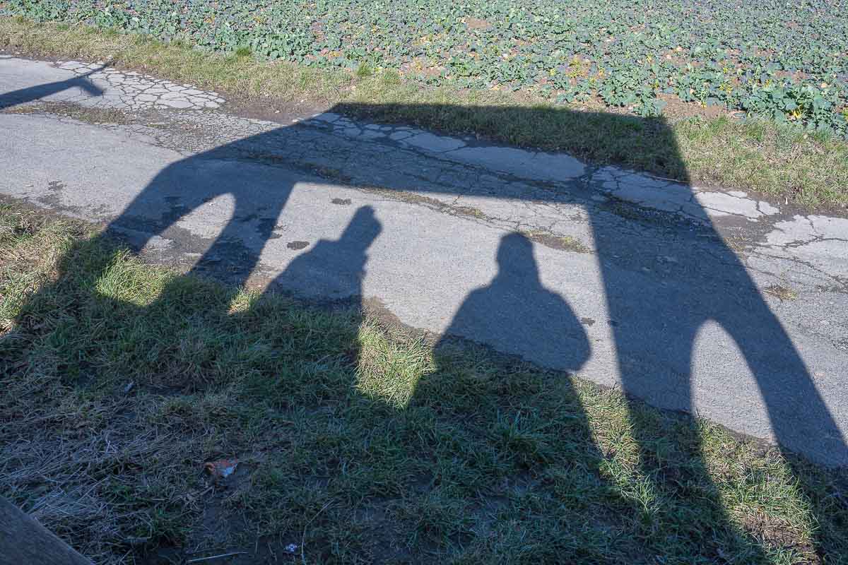 Der Wanderweg führte nun über offenes Gelände. Das Wetter war so schön das wir fast schon ins Schwitzen kamen. 13°C im Februar, das ist schon was. Kurz vor einer ehemaligen Bahnlinie bogen wir rechts ab und mußten ein Stück auf einem Weg parallel zur Strasse laufen. Der Verkehr dort hielt sich aber in Grenzen.