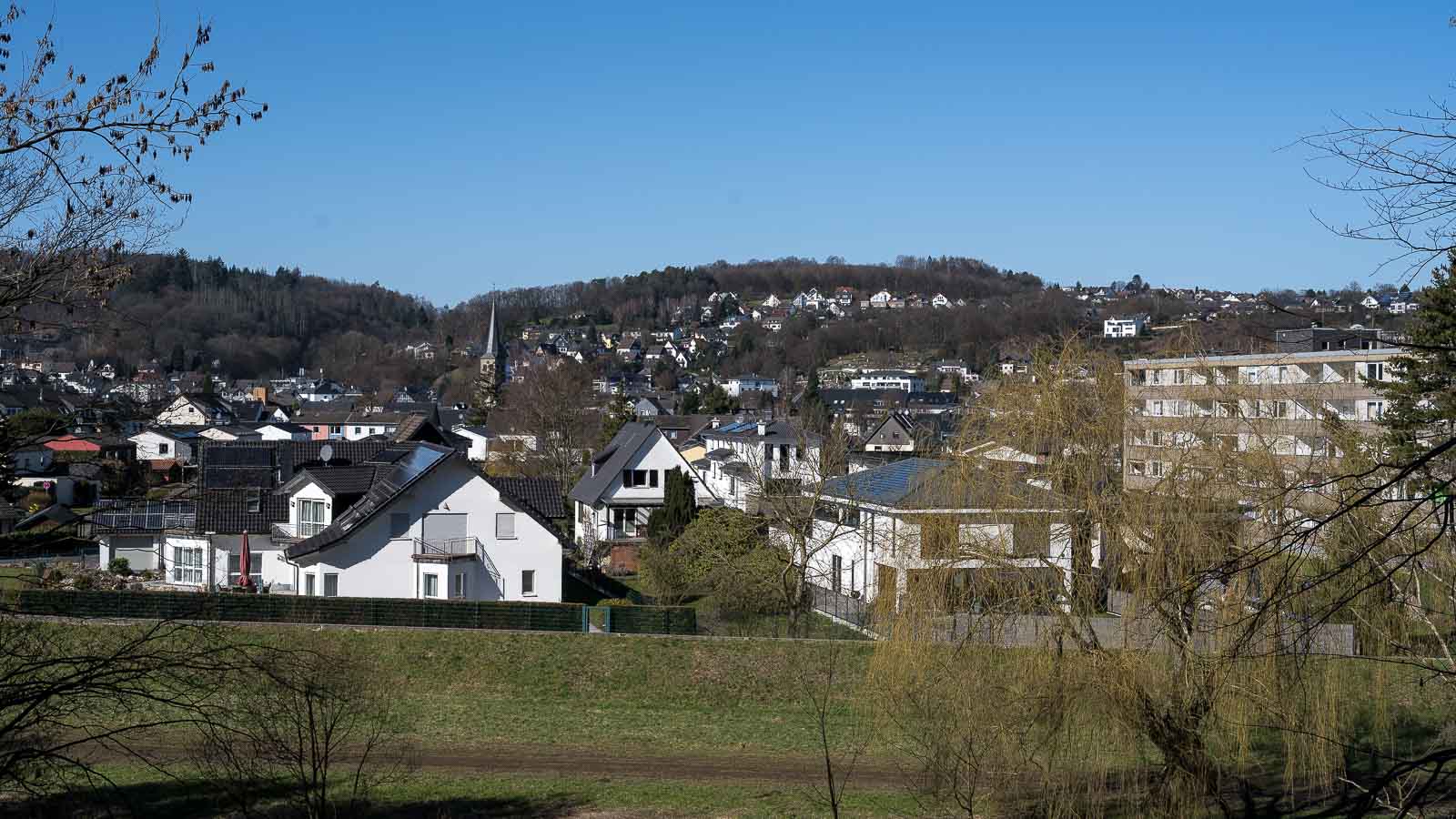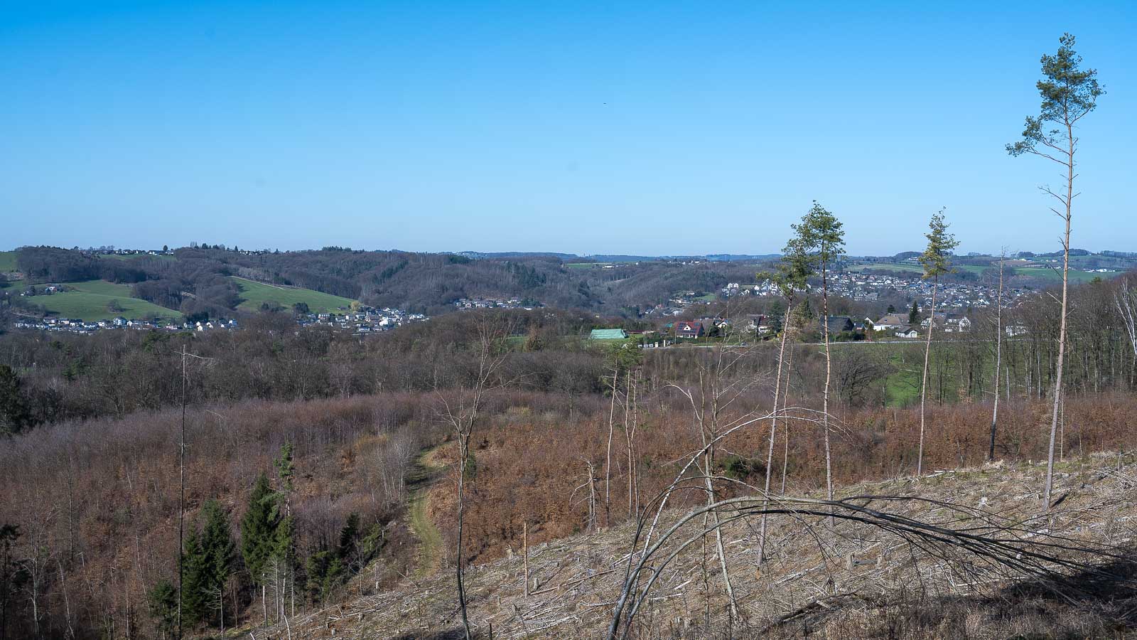 Bald machte unser Track eine scharfe Linkskurve und führte uns bergauf. Je höher wir kamen, um so besser wurde die Aussicht. So kurz vor dem Örtchen Lölsdorf hatten wir den besten Ausblick über das Bergische Land. Hinter dem Ort Leyenhaus erreichten wir das Eulental. Der Taleinschnitt ist recht eng und unterwegs spielte mein Navi etwas verrückt und zeichnete nur noch einen Zick-Zack-Track auf. Den habe ich ausnahmsweise mal nicht korrigiert. Die Wege sind so gut gekennzeichnet das man kann sich hier nur schwer verlaufen kann.