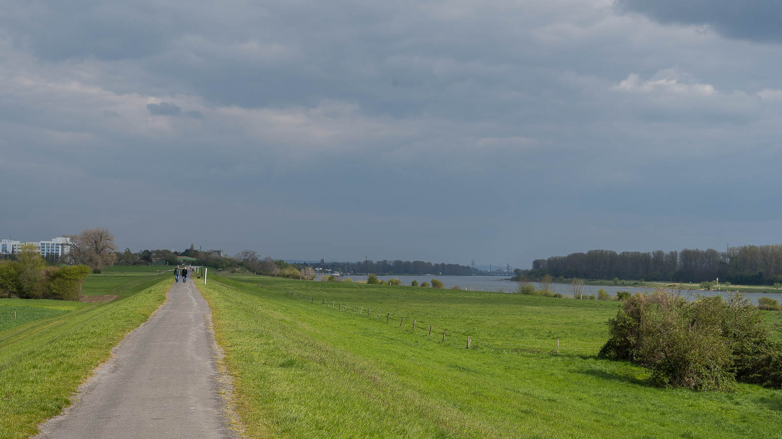 Wir genossen die Flußlandschaft für mehrere Kilometer. Auf gegenüberliegenden Rheinseite sahen wir die Chemie-Anlagen des Bayer Werkes Dormagen. Auf dem Fluß waren relativ wenig Schiffe unterwegs. Da haben wir auf unseren diversen Wanderungen am Rhein schon mehr erlebt. Nach etwa 2-3 km verließen wir den direkten Uferbereich und wanderten auf dem Deich weiter in Richtung Hitdorf. Die düsteren Wolken die am Horizont herauf dräuten verflüchtigten sich schon bald und die gefürchtete Dusche blieb zum Glück aus.